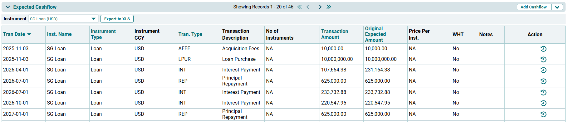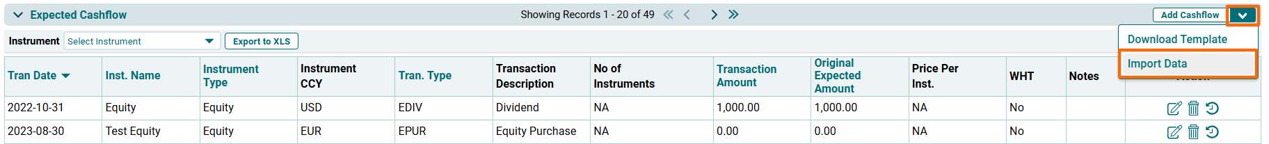 3. To import bulk cashflows for instruments, click on the down arrow button next to Add Cashflow button. Click on Import Data.