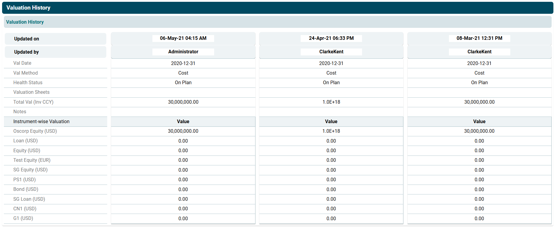 ) icon in the Action column. The Valuation History window is displayed. You can view when were the changes made and by whom.