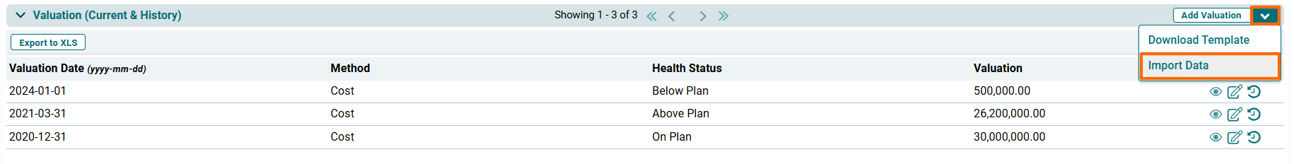 3. To import bulk valuation for instruments, click on the down arrow button next to Add Valuation button. Click on Import Data.