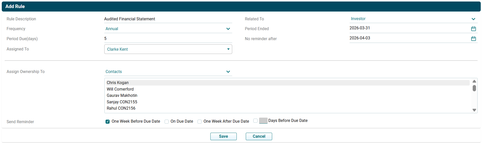 2. The Add Rule window is displayed. Update the details. Click Save.