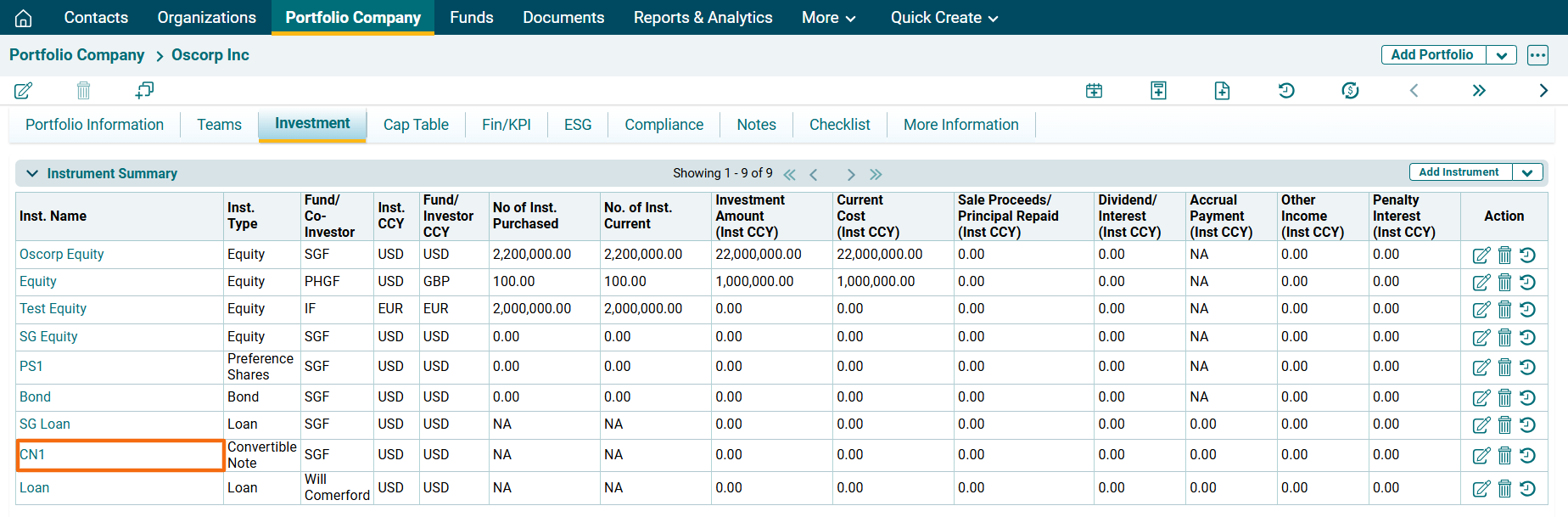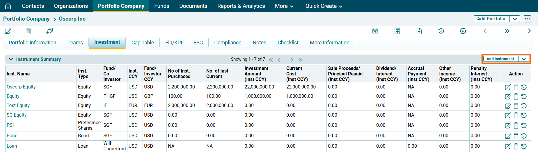 • Investee Company Name: Displays the name of the portfolio company associated with the instrument. This is an auto-generated field.