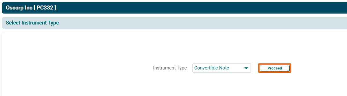 2. The Instrument Type window is displayed. Select Convertible Note from the Instrument Type dropdown list. Click Proceed.
