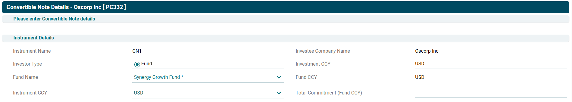 • Total Commitment: Specify the total amount of fund committed in the instrument.