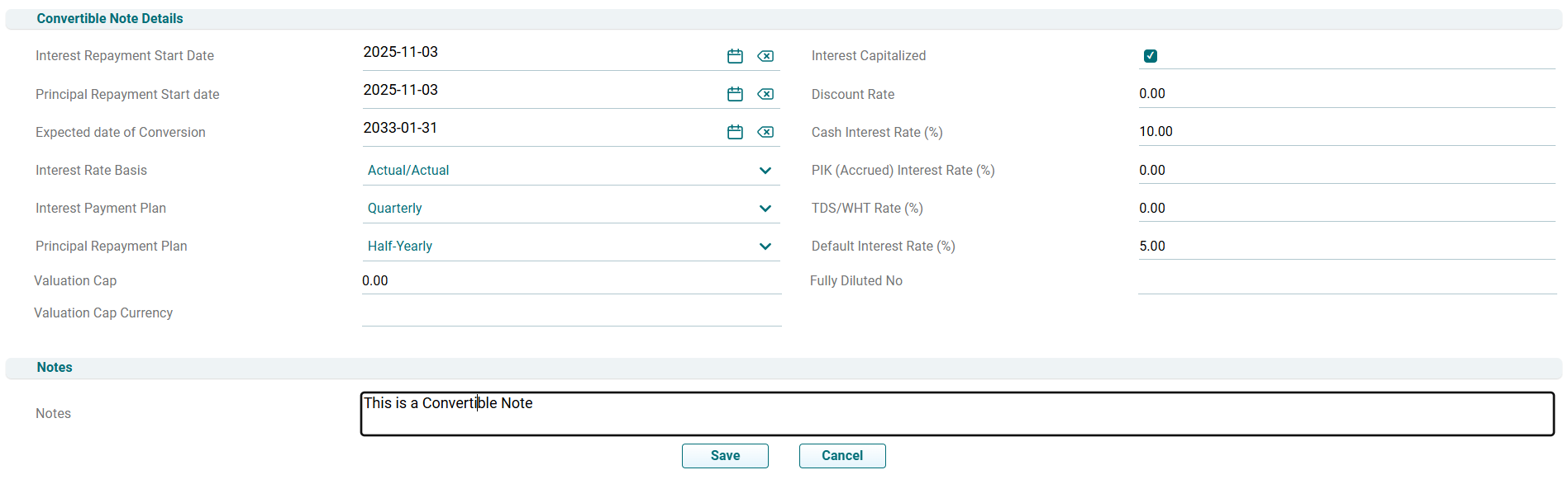 3. The Convertible Note Details window is displayed. Enter the following details: