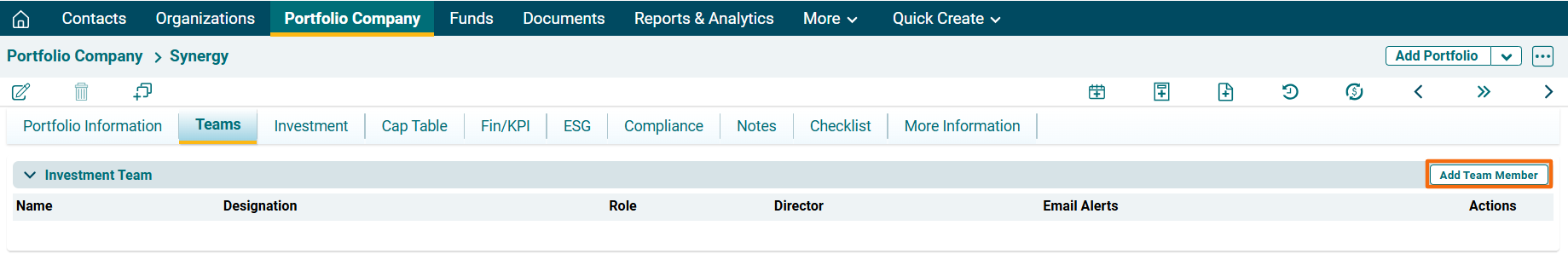 Investment Team panel captures details of internal team members associated with the portfolio. The details included are: