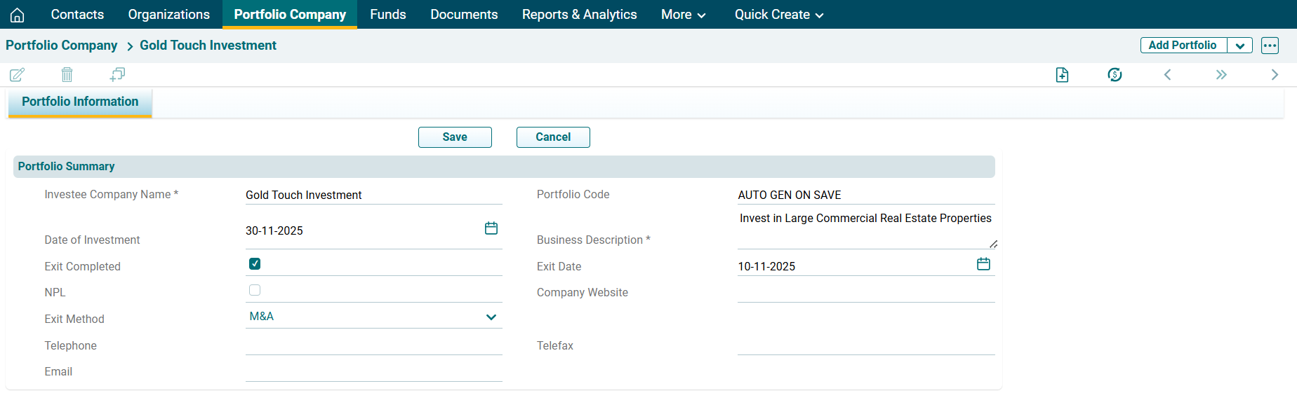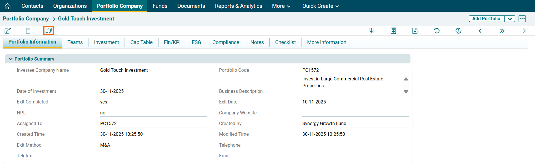 2. The Portfolio Company Information window is displayed. Click on the Duplicate icon in the top left corner.