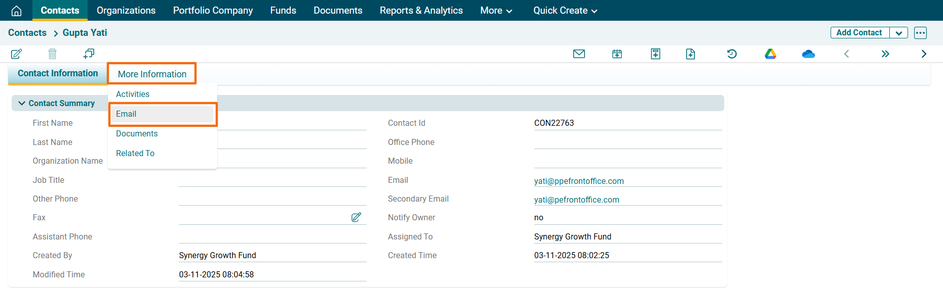 2. Navigate to the More Information tab and Click on Email.
