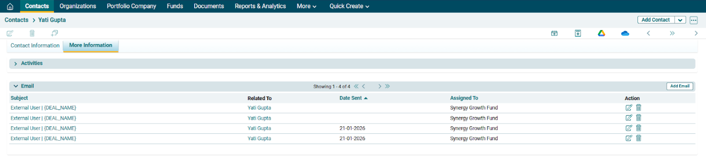 In the Email panel, emails can be attached to a particular contact from Outlook Plugin. To view Emails, follow the below steps: