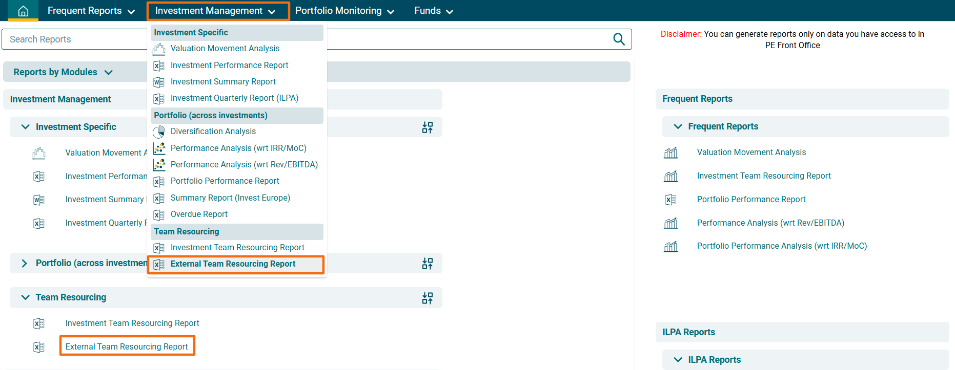 2. You can access the report from the dashboard by clicking External Team Resourcing Report in the Investment Management panel or from the Investment Management drop-down menu in the blue vertical bar.
