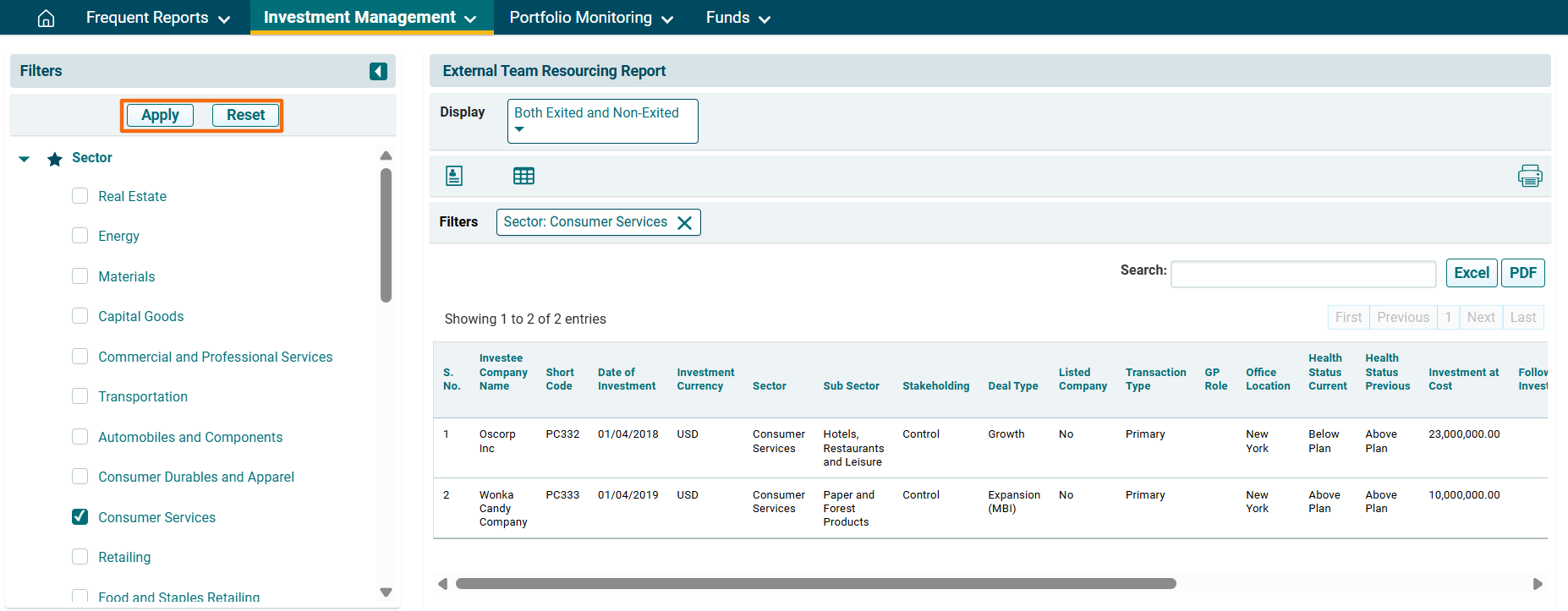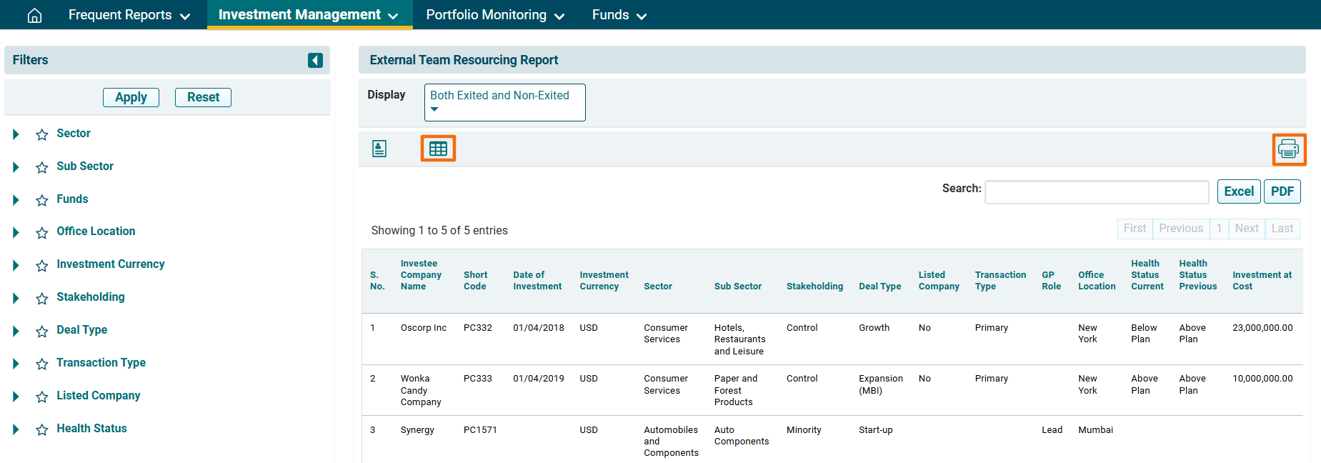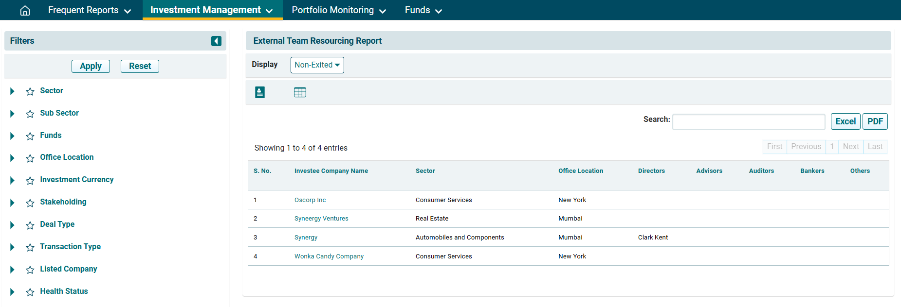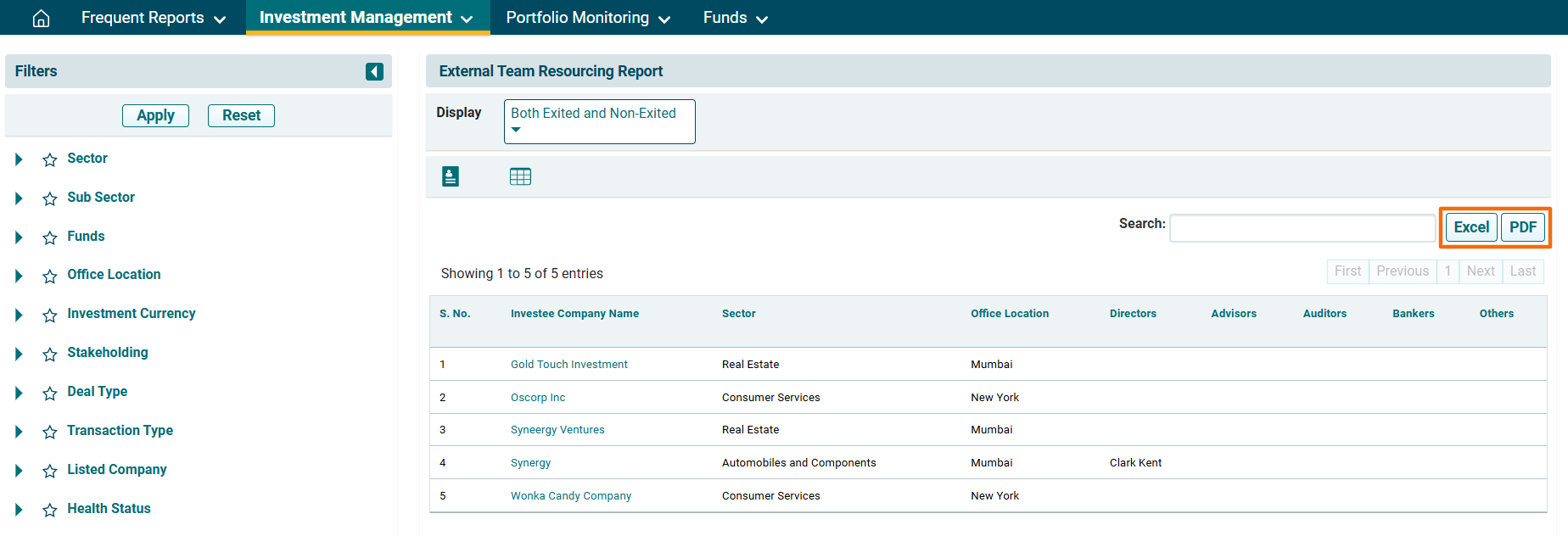 - Display: To view all the portfolio companies including Exited, Non-Exited, or Both Exited and Non-Exited.