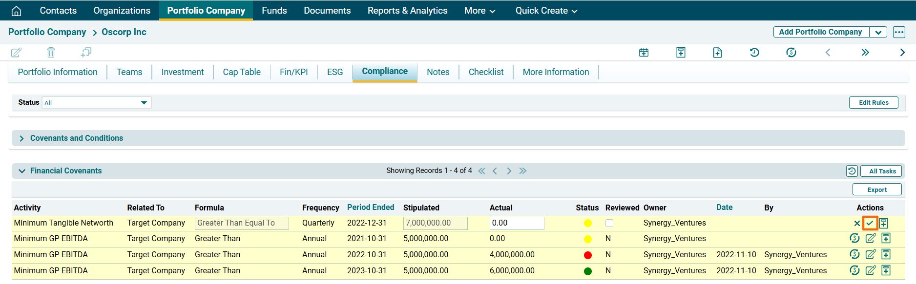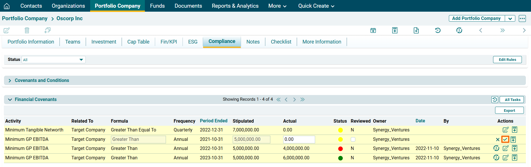 Once the rule has been defined for the financials in Financial Covenants, the data displays here. The system calculates Actual value to be displayed and these are editable.