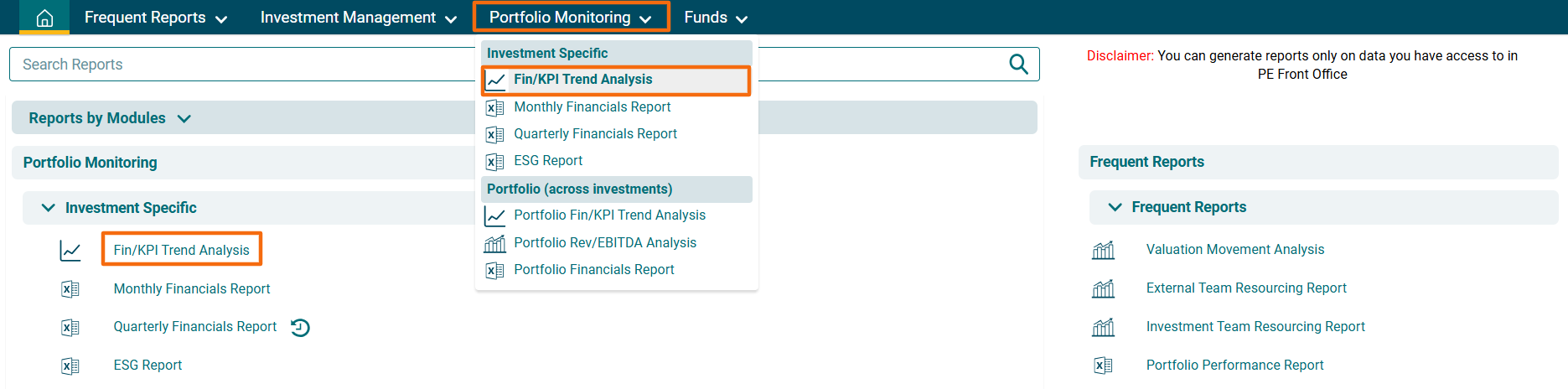 2. You can access the report from the dashboard by clicking Fin/KPI Trend Analysis in the Portfolio panel or from the Portfolio drop-down menu in the blue vertical bar.