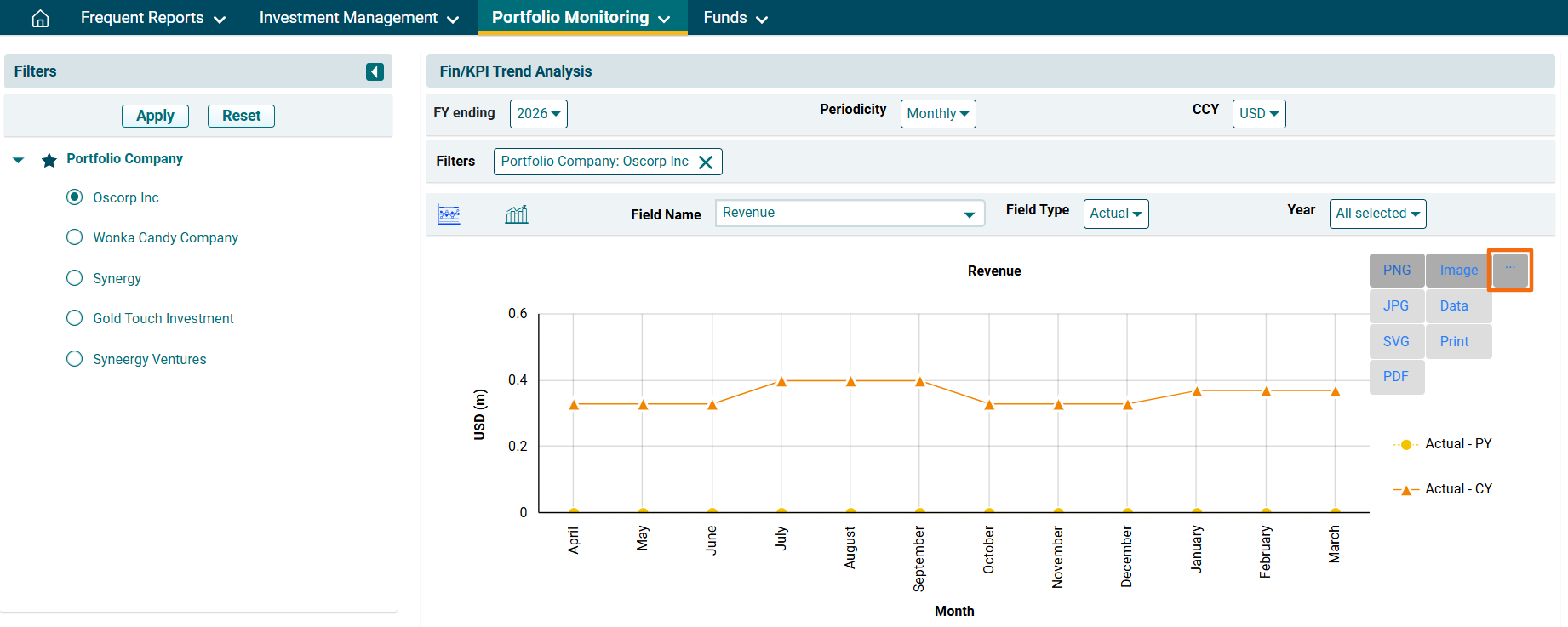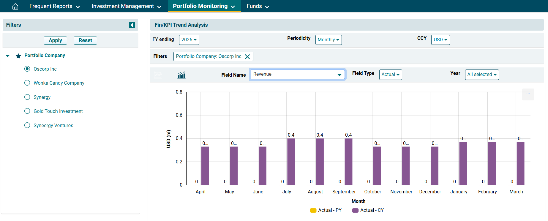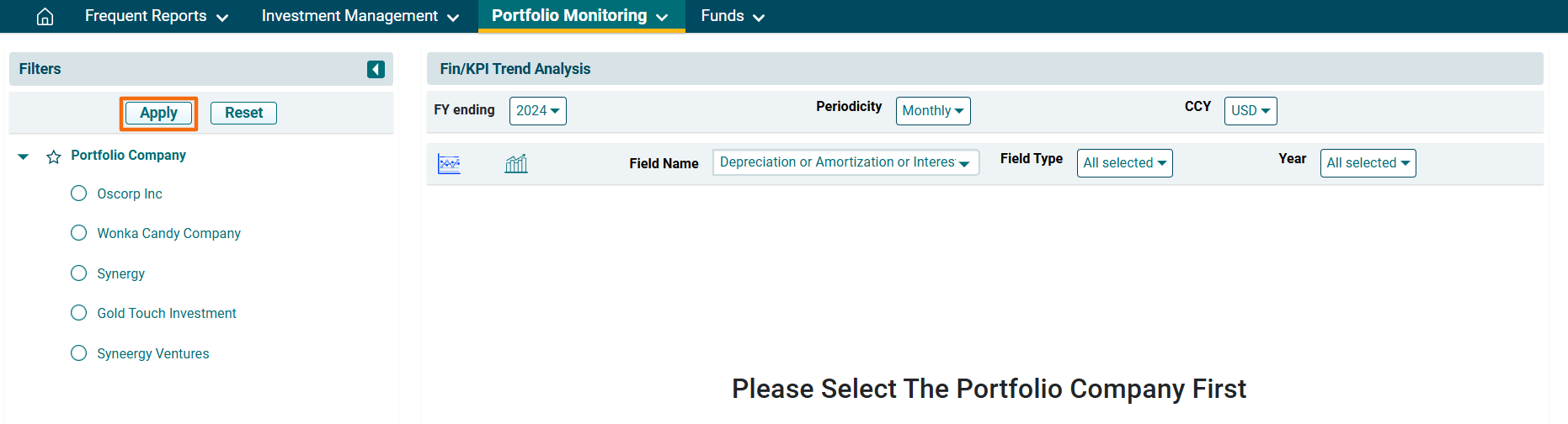 3. The Fin/KPI/ESG Trend Analysis window is displayed. Using the filters on the left-hand side, select the Portfolio Company. Click Apply.