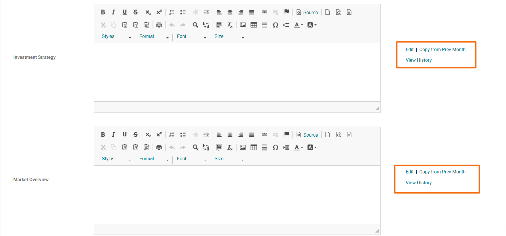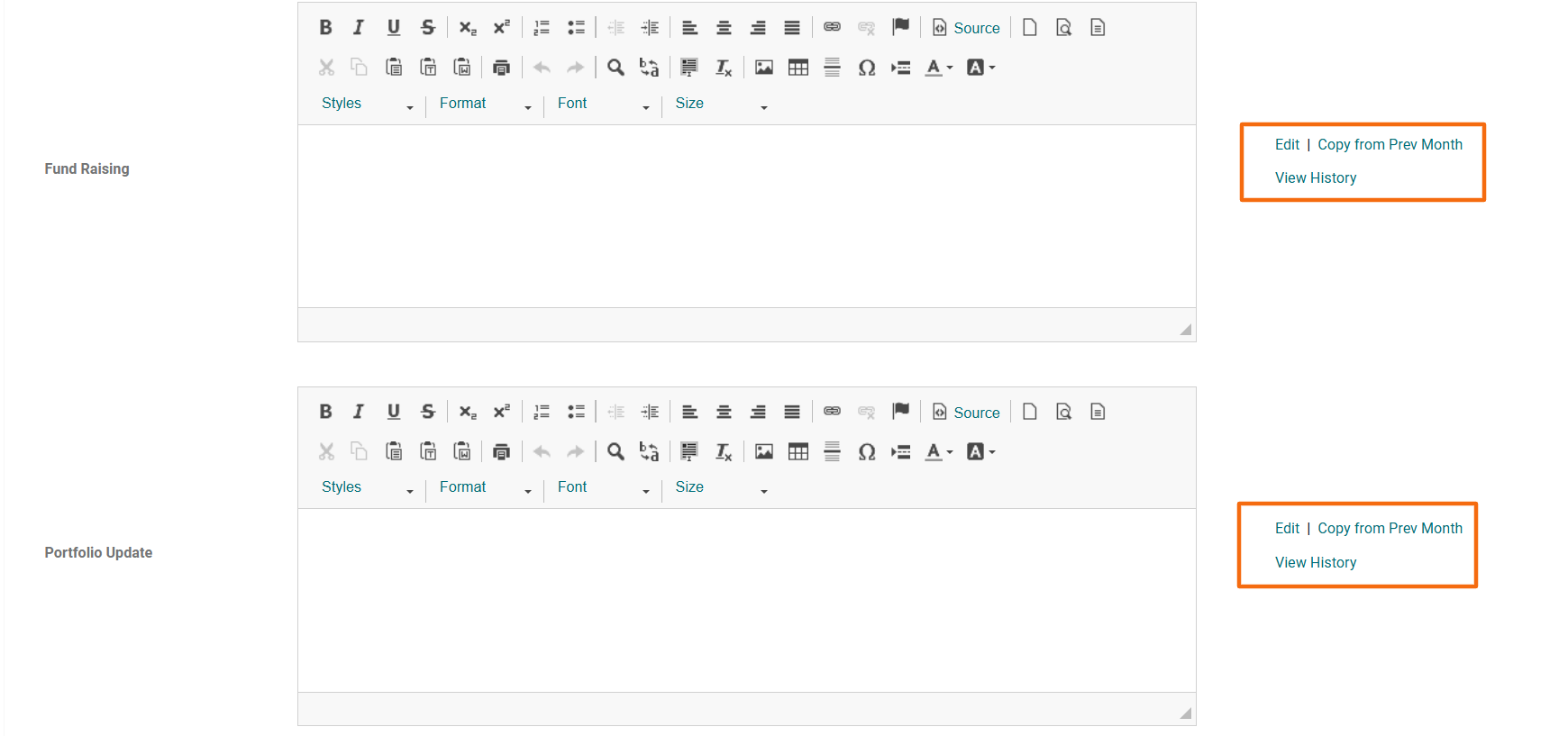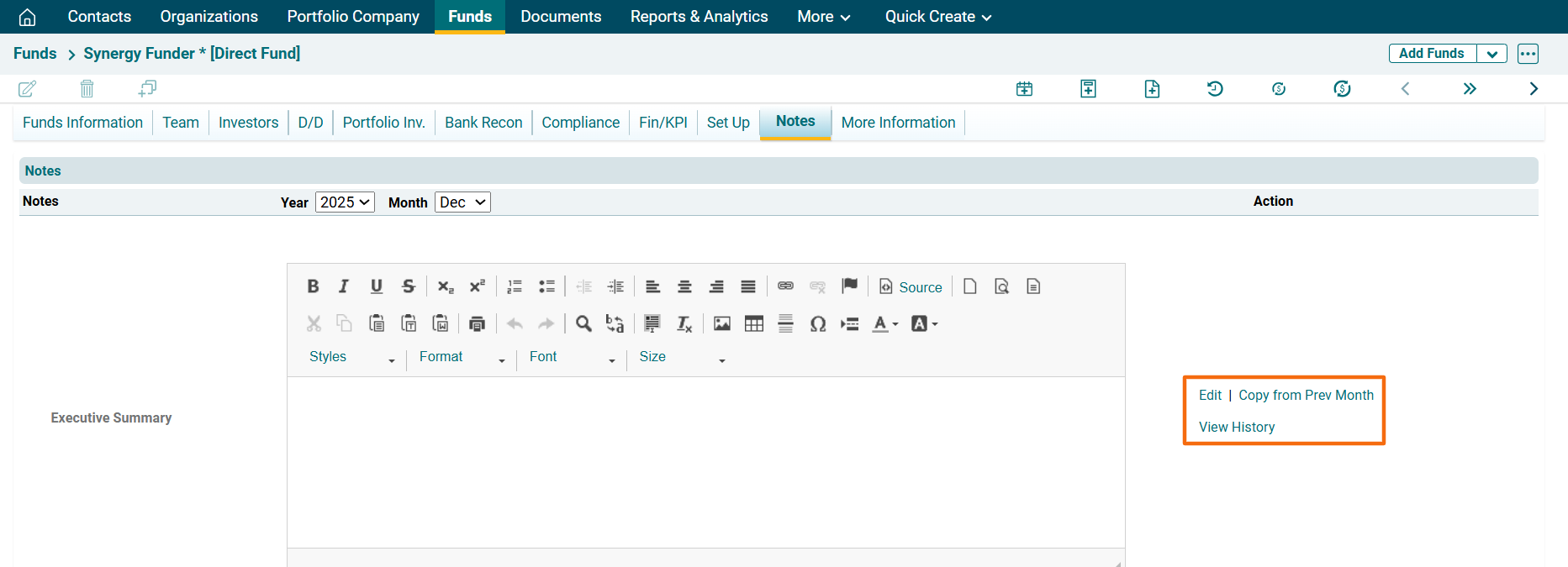 In this tab, you can capture notes related to Executive Summary, Investment Strategy, Market Overview, Fund Raising, Portfolio Update and Deals Update. You can edit the notes or copy the notes previous month into the current month or view the history of notes using the buttons in the Action column.