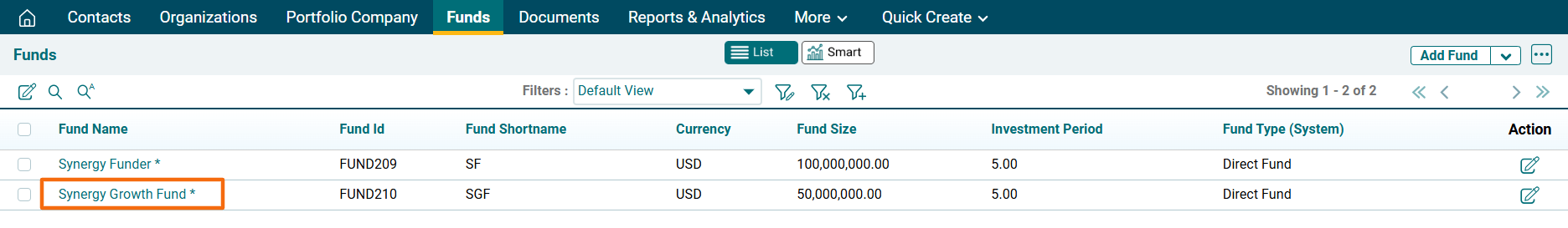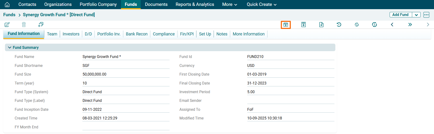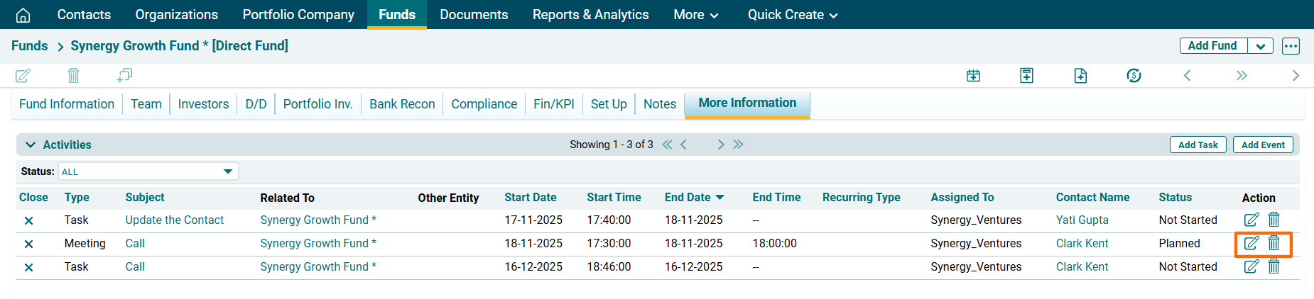 1. Click on a Fund Name for which event has to be created.