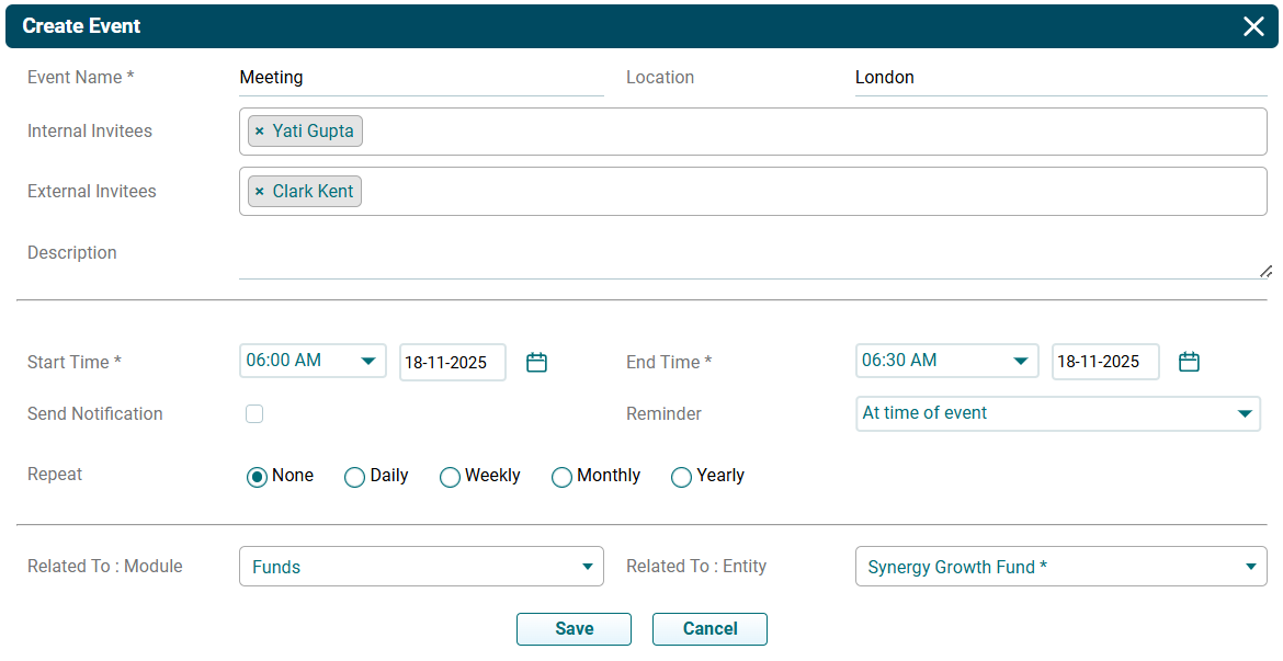 - Related To (Module): Event gets related to the module automatically.