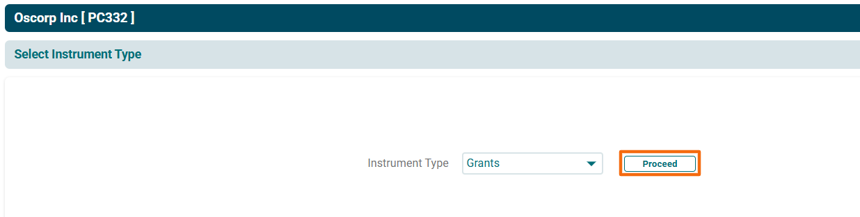2. The Instrument Type window is displayed. Select Grants from the Instrument Type dropdown list. Click Proceed.