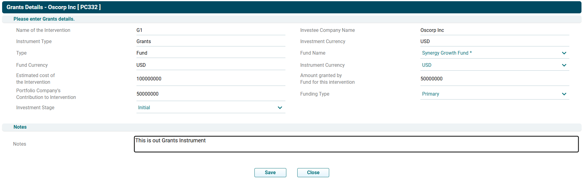 • Investee Company Name: Displays the name of the portfolio company associated with the instrument. This is an auto-generated field.
