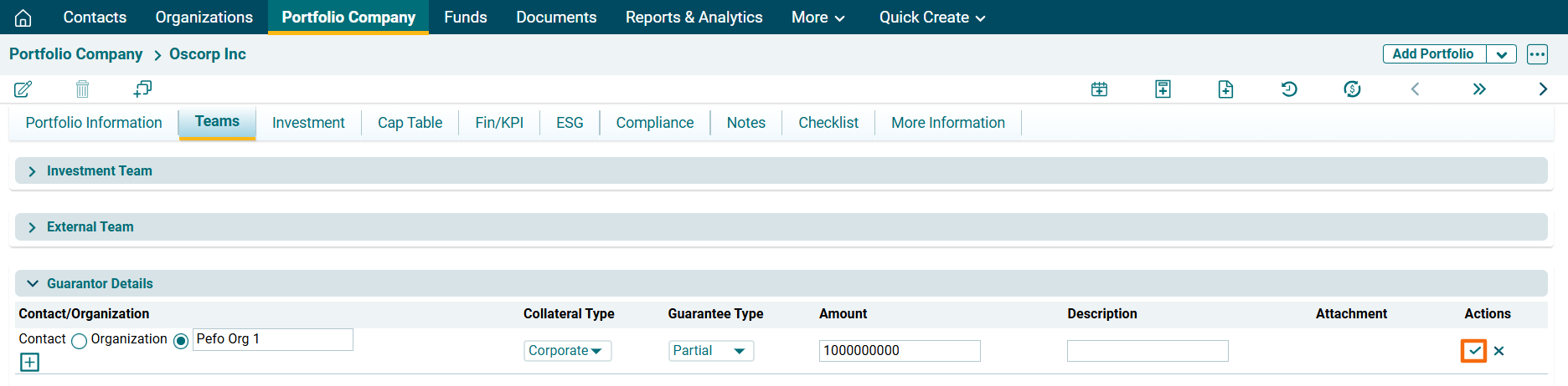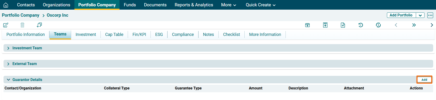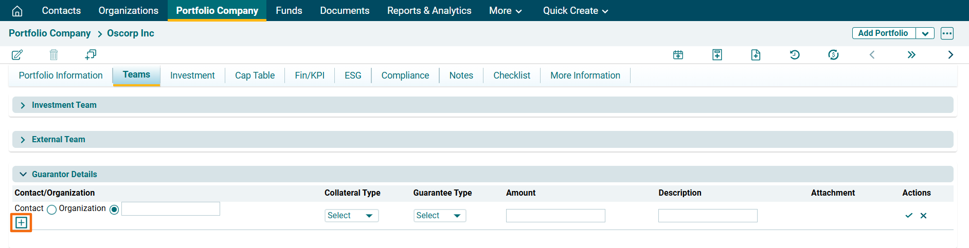 Guarantor Details panel captures details of the guarantors associated with the portfolio company. The details included are: