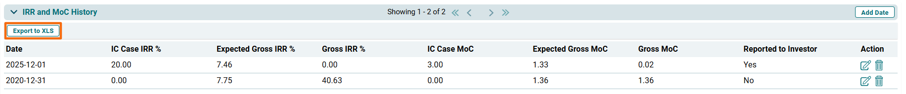 To view and download the IRR & MoC History report in excel file, click on Export to XLS button in the top left corner of the panel.