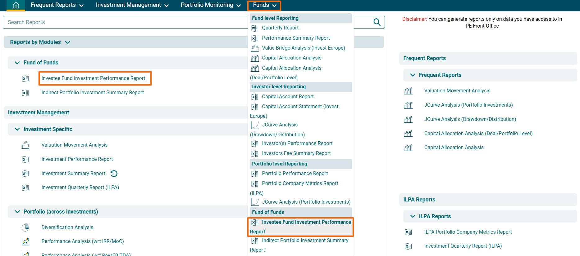 2. You can access the report from the dashboard by clicking Investee Fund Investment Performance Report in the Funds panel or from the Funds drop-down menu in the blue vertical bar.