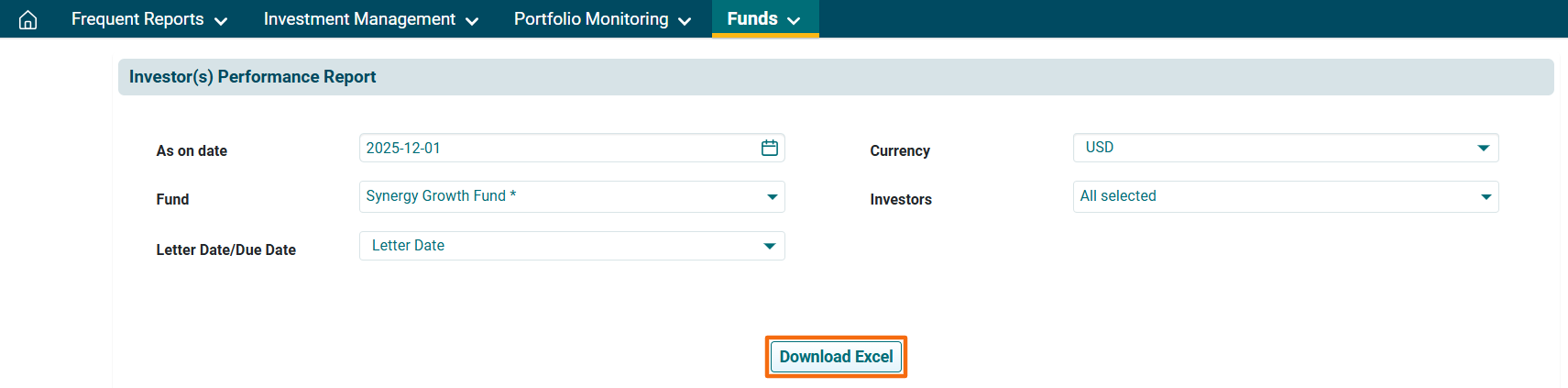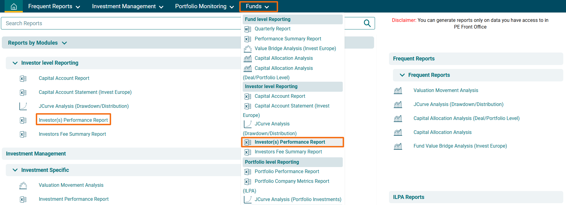 2. You can access the report from the dashboard by clicking Investor(s) Performance Report in the Funds panel or from the Funds drop-down menu in the blue vertical bar.