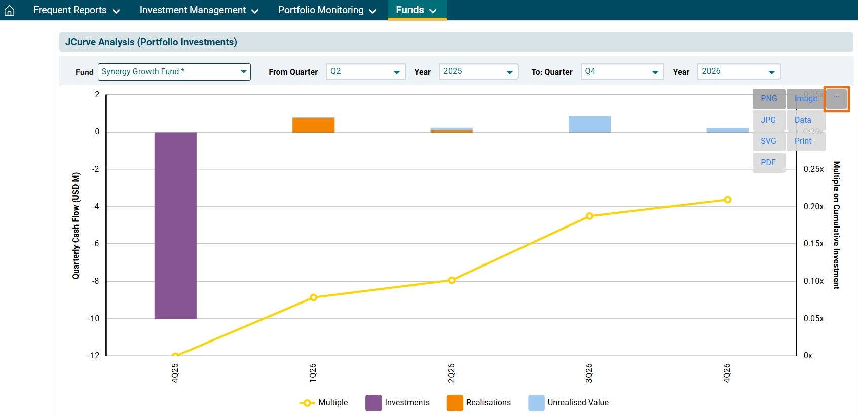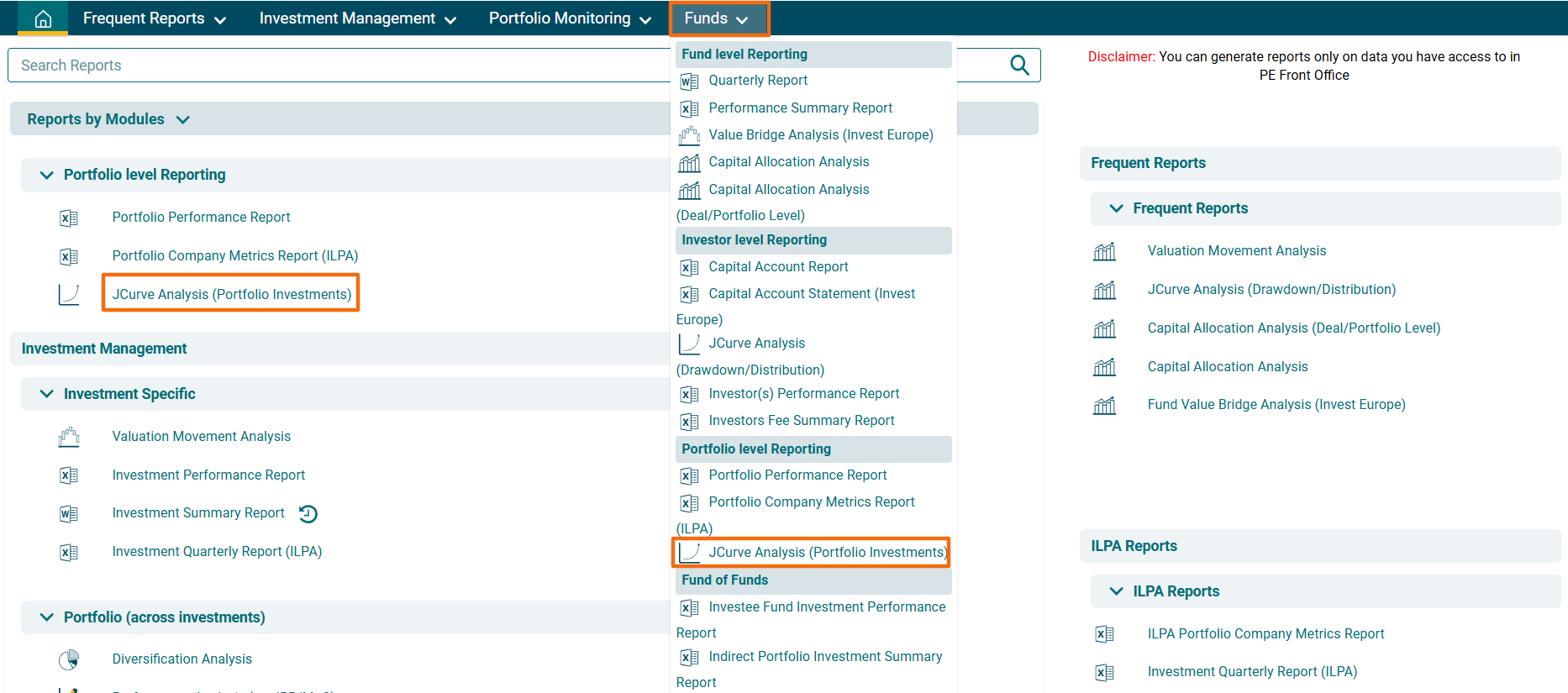 2. You can access the report from the dashboard by clicking JCurve Analysis (Portfolio Investment) in the Funds panel or from the Funds drop-down menu in the blue vertical bar.