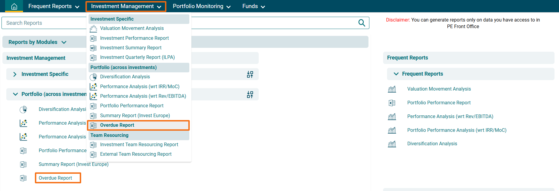 2. You can access the report from the dashboard by clicking Overdue Report in the Investment Management panel or from the Investment Management drop-down menu in the blue vertical bar.