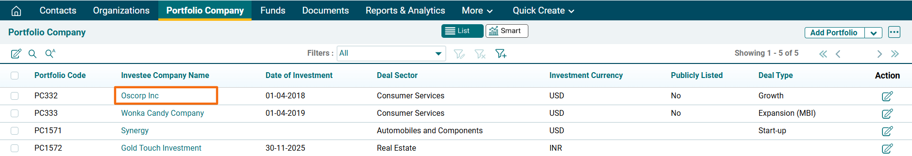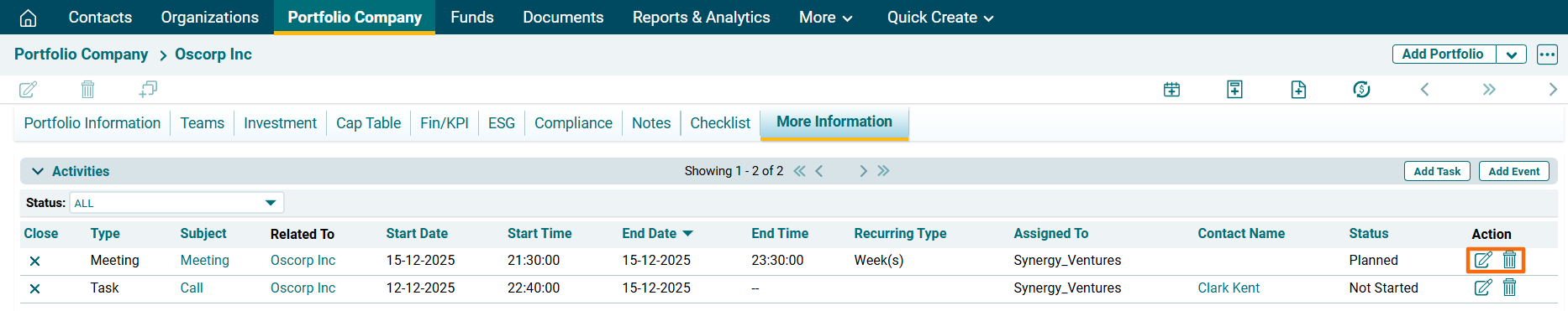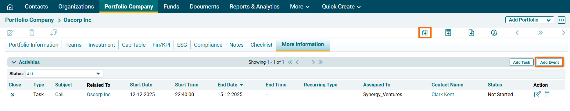 1. Click on a Investee Company for which event has to be created.