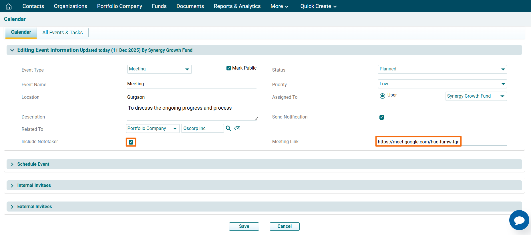 ) in the Actions column. Check the Include Notetaker checkbox. Post the Meeting Link. Click Save.