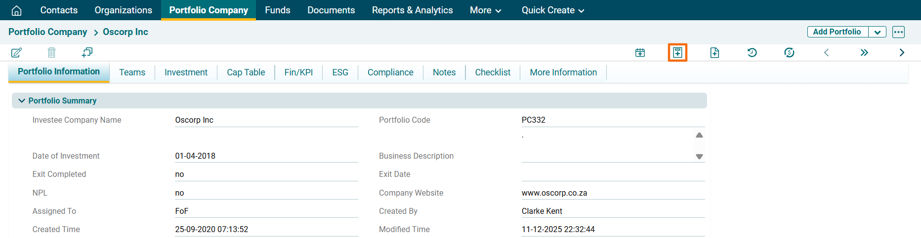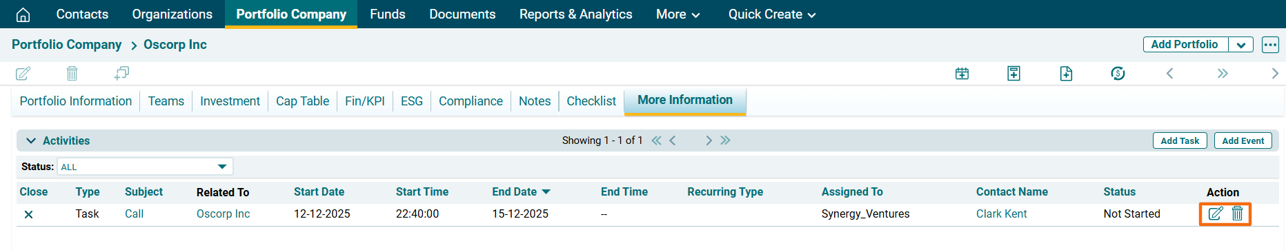 1. Click on the Investee Company for which task has to be created.