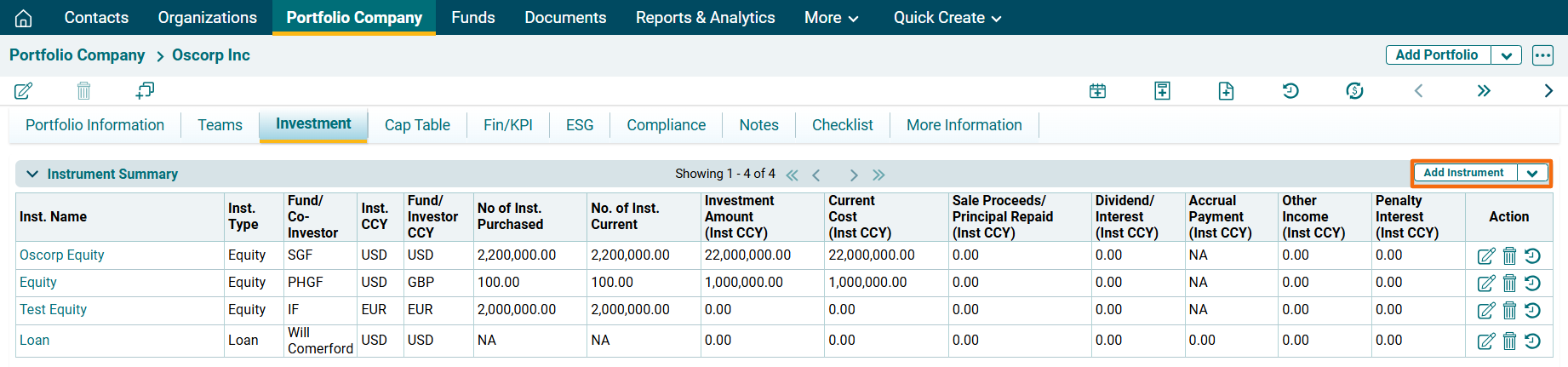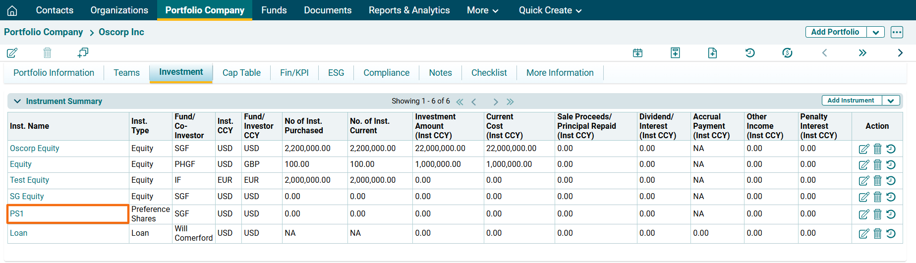 • Investee Company Name: Displays the name of the portfolio company associated with the instrument. This is an auto-generated field.