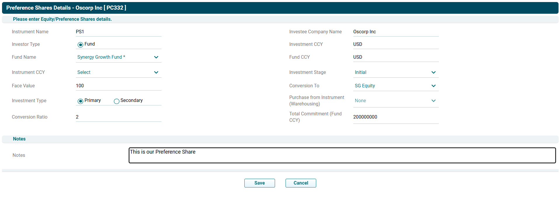 • Investor Type: Choose whether Fund or Co-investor is investing in the instrument.