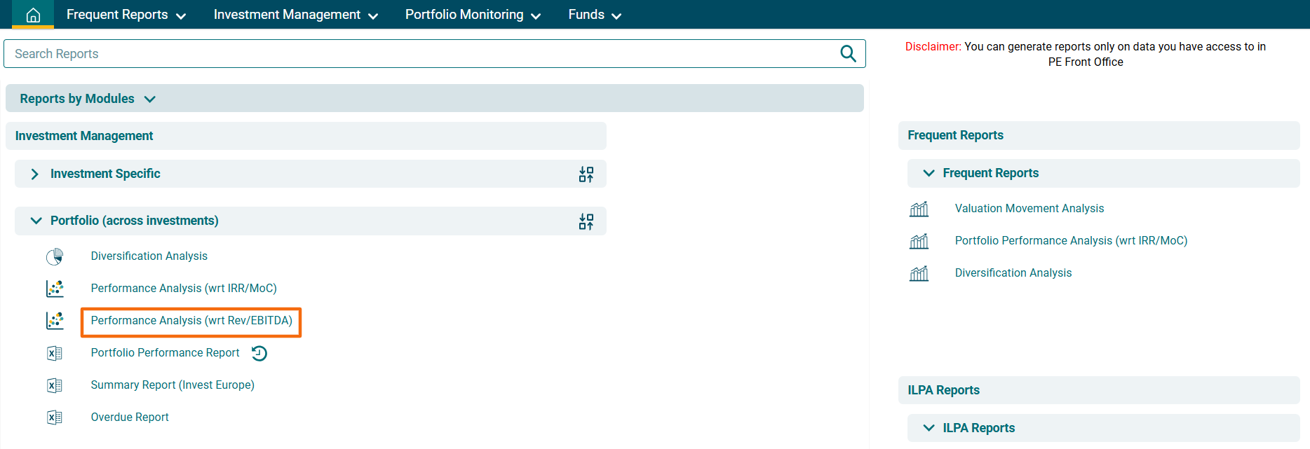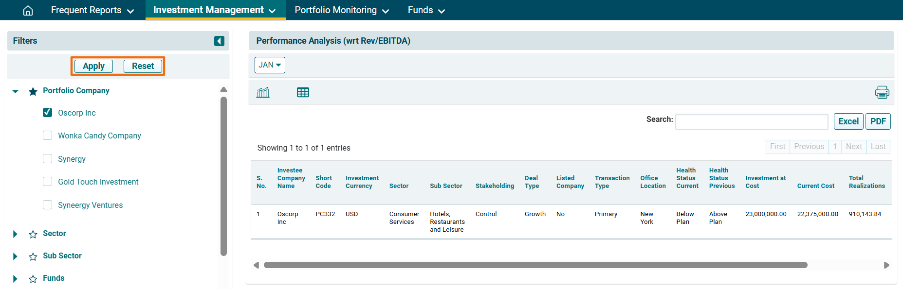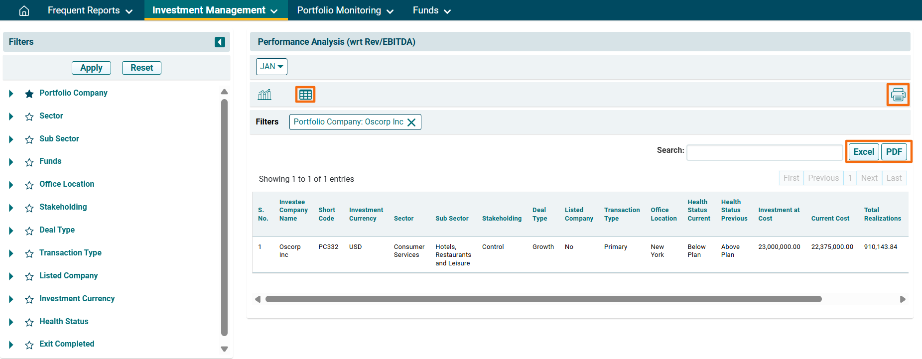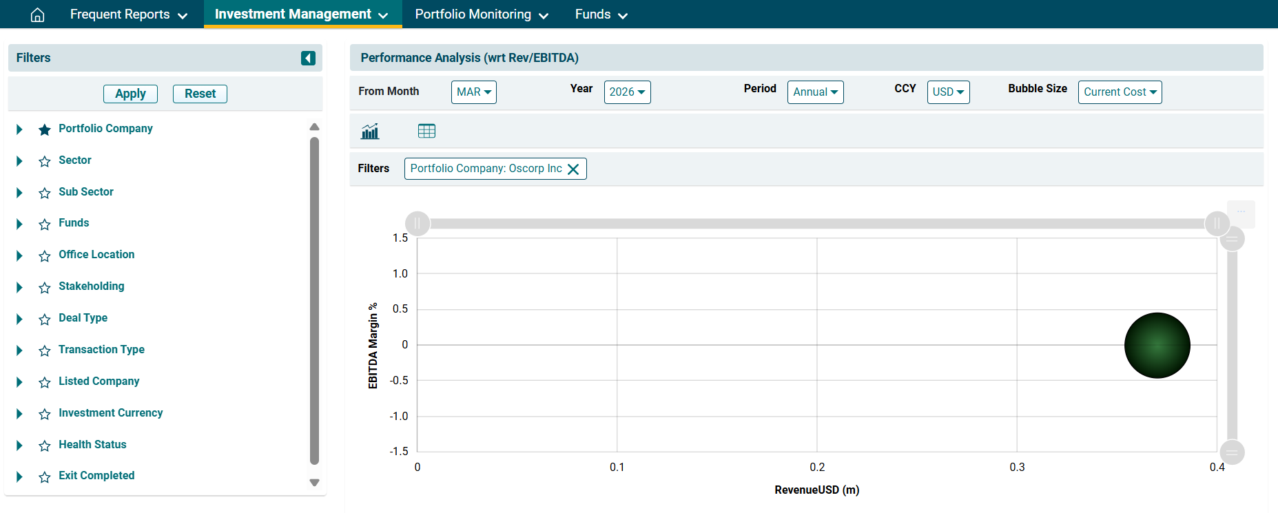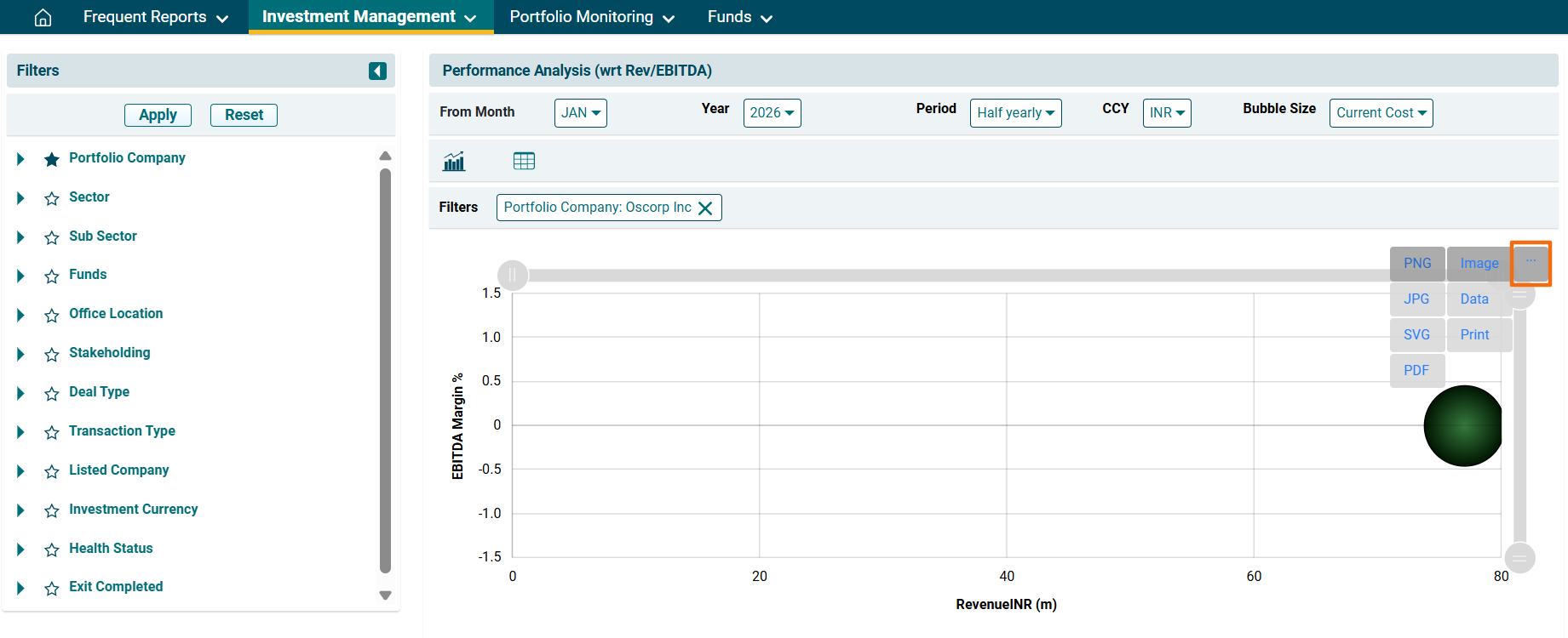 2. A new window is displayed. You can access the report from the dashboard by clicking Performance Analysis (wrt Rev/EBIDTA) in the Investment Management panel or from the Investment Management drop-down menu in the blue vertical bar.