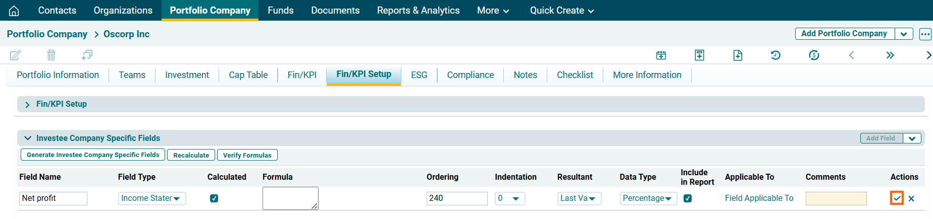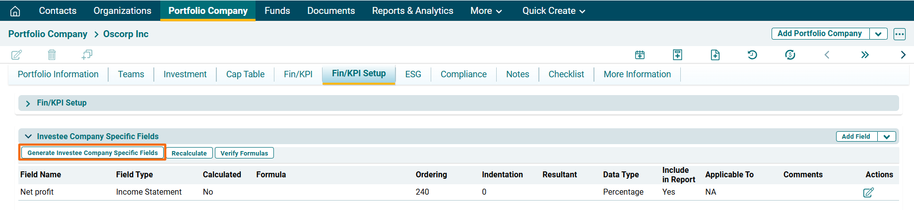 Navigate to Investee Company Specific Fields panel.