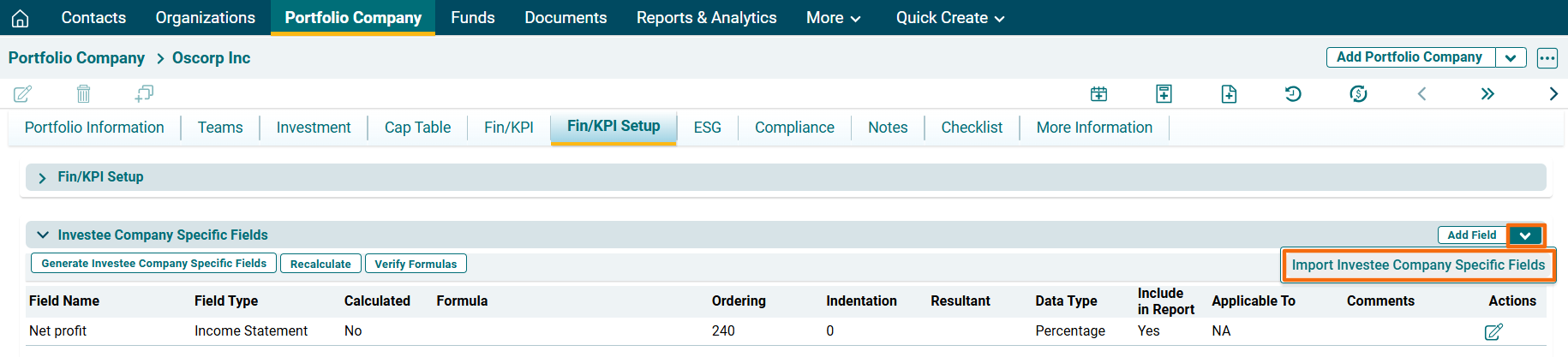4. To import Investee Company Specific fields, click on the down arrow button next to Add Field button. Click on Import Investee Company Specific Fields.