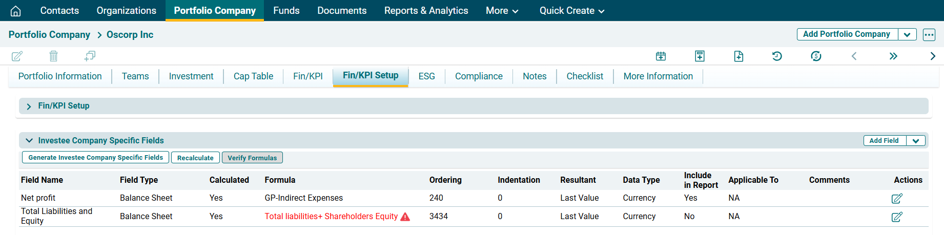 To verify the Investee Level Field Formulas, click on Verify Formula button () in the top left corner of the panel.