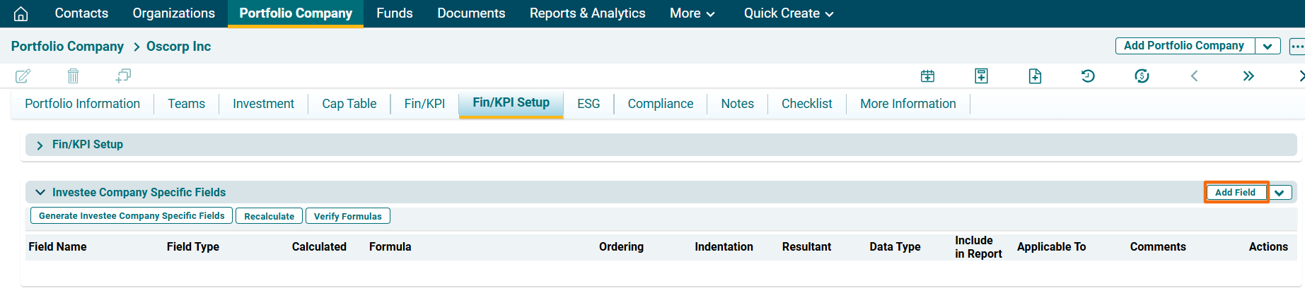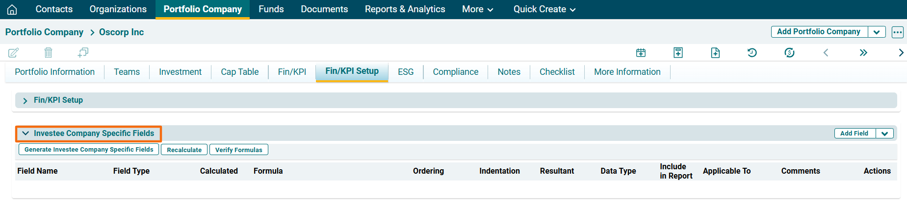To modify Investee Company Specific Fields, follow the below steps: