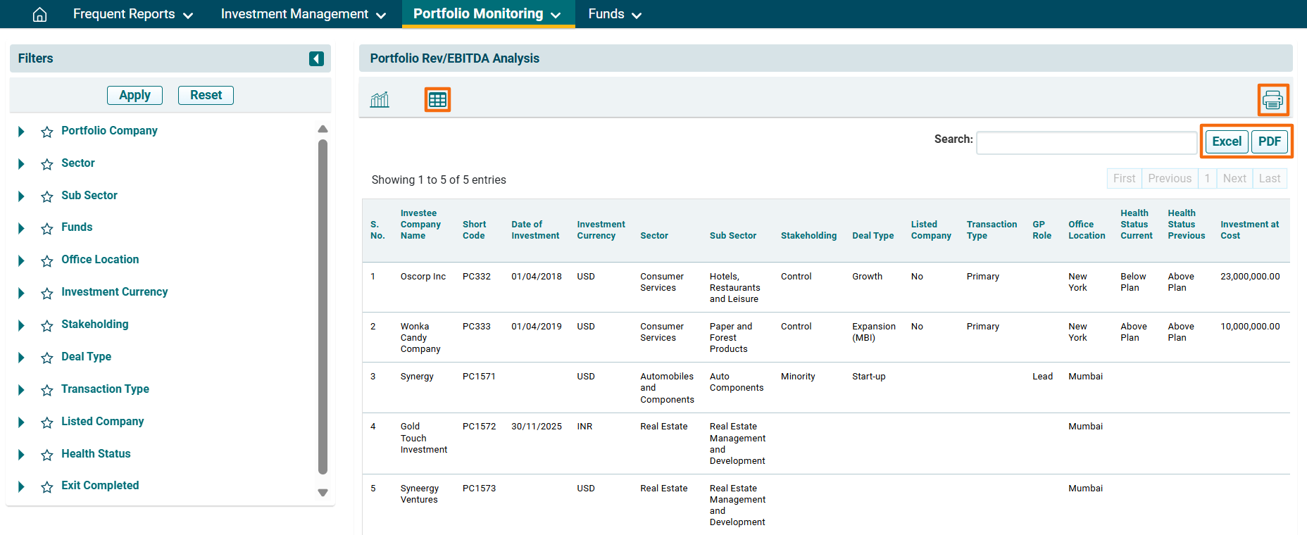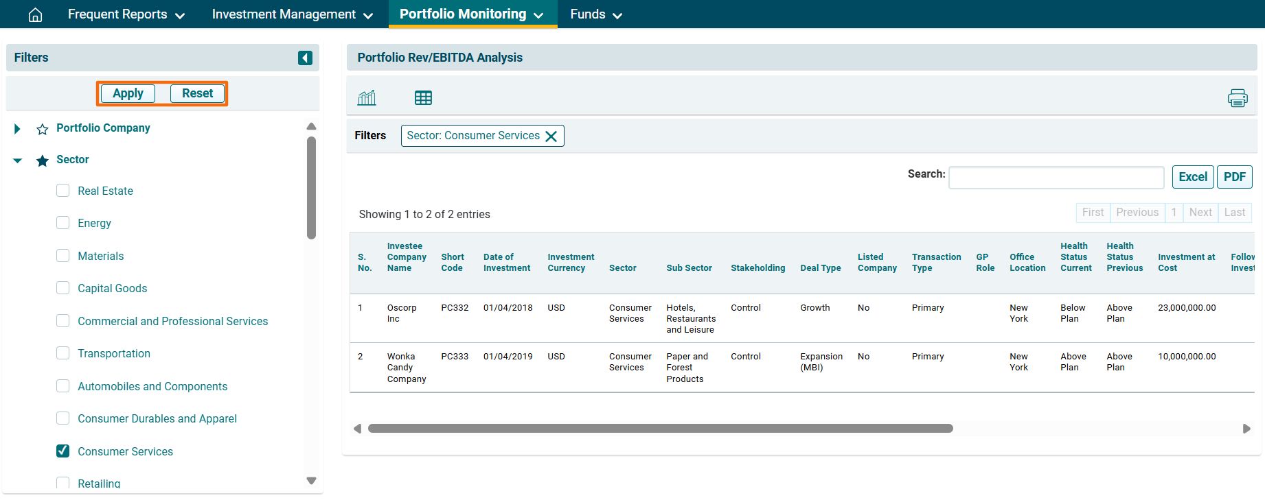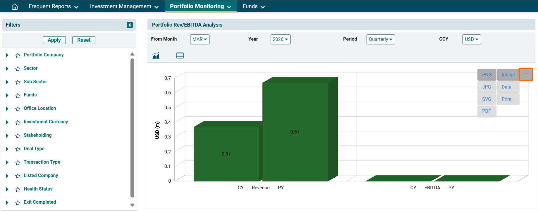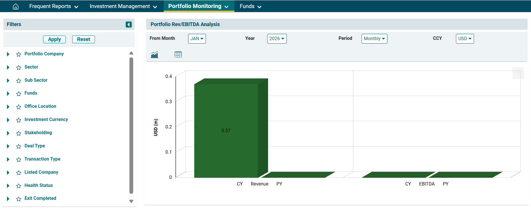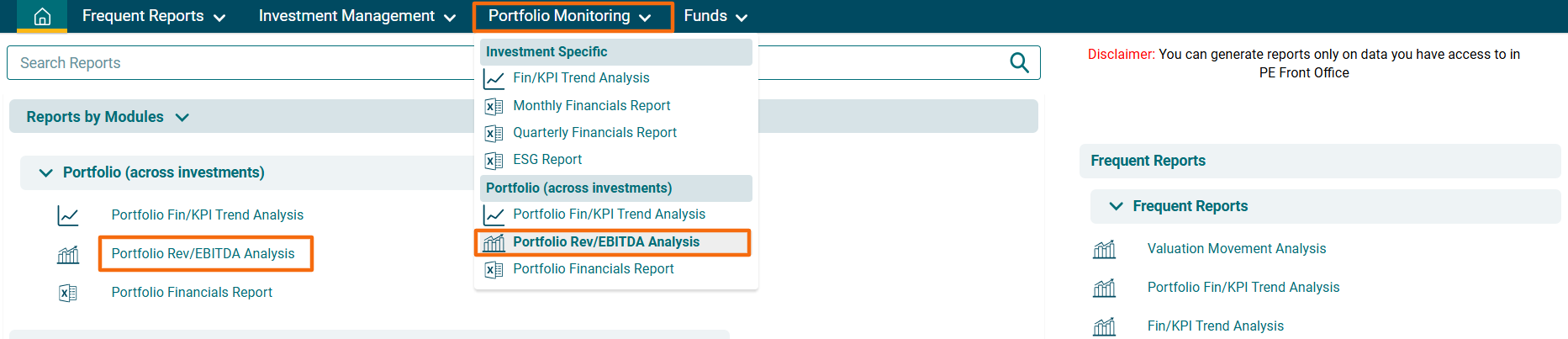 2. You can access the report from the dashboard by clicking Portfolio Rev/EBIDTA Analysis in the Portfolio Monitoring panel or from the Portfolio Monitoring drop-down menu in the blue vertical bar.