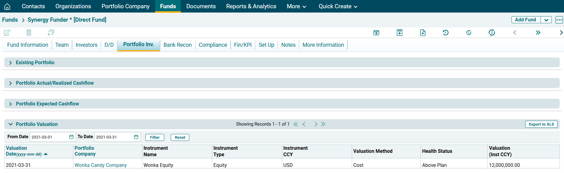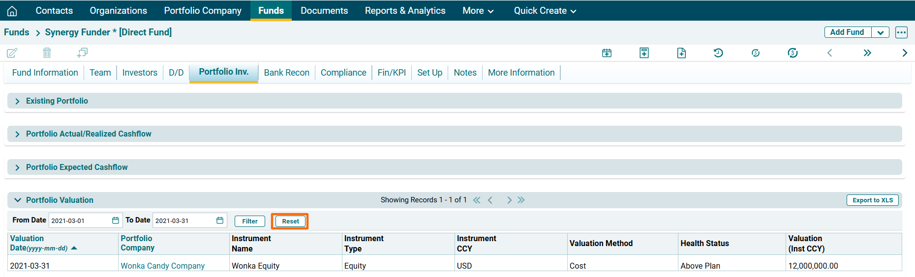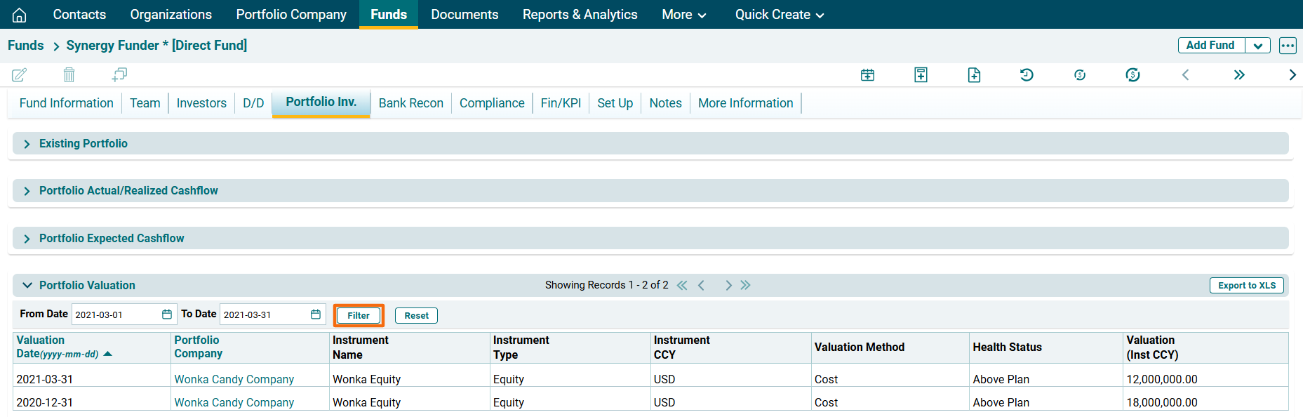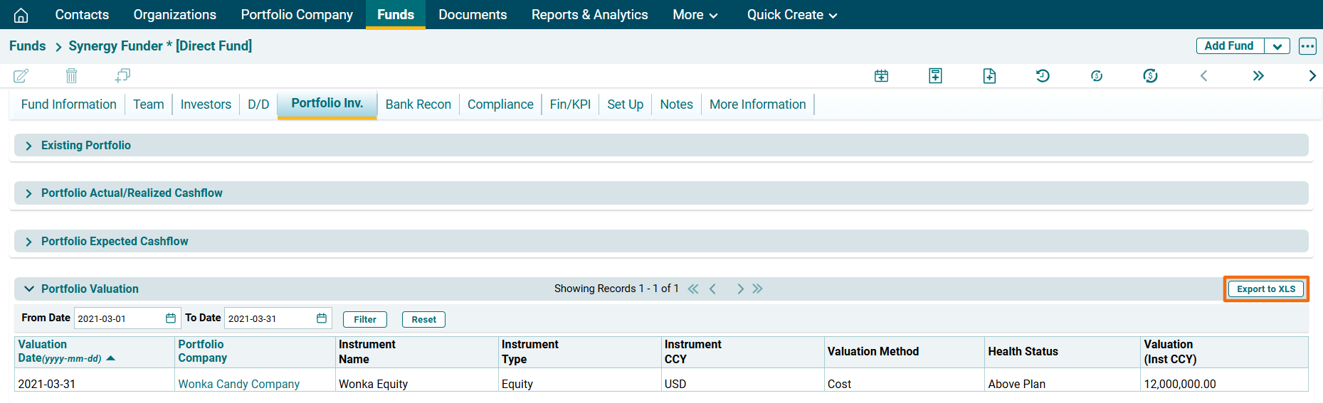 To export the Portfolio Valuation data into excel, click on Export to XLS button in the horizontal bar of the panel. The Excel file will download.