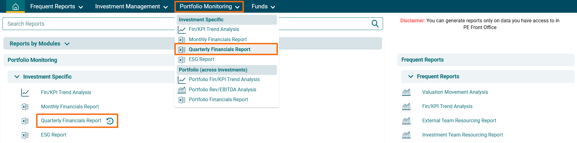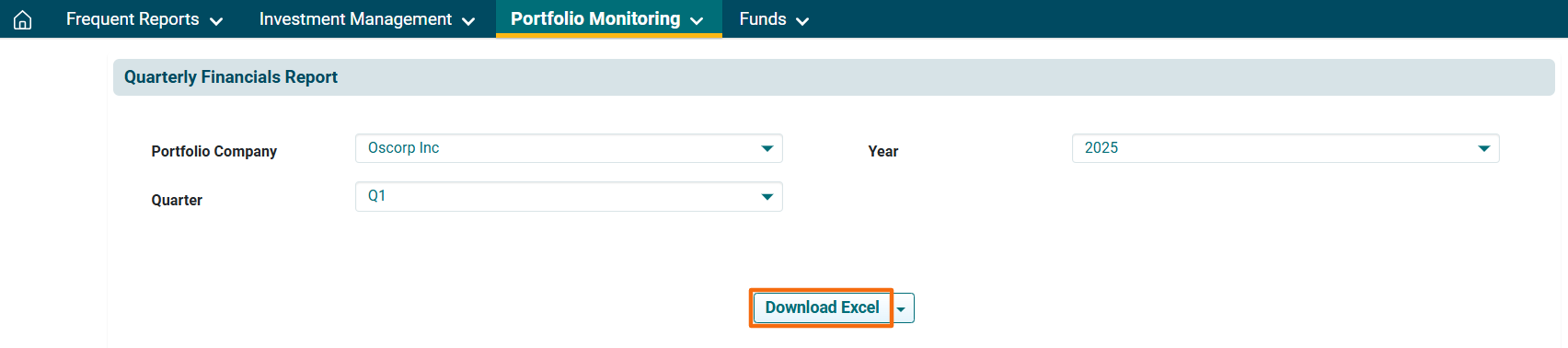 2. You can access the report from the dashboard by clicking Quarterly Financials Report in the Portfolio Monitoring panel or from the Portfolio Monitoring drop-down menu in the blue vertical bar.