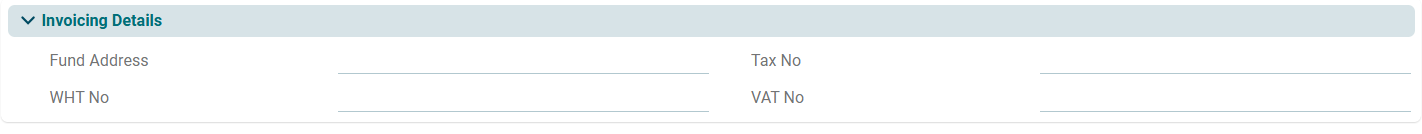 This panel allows you to enter the fund’s invoicing details, including the fund address, WHT rate, tax number, and VAT number.
