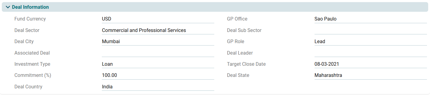 This panel allows you to enter details of the deal associated with the fund.