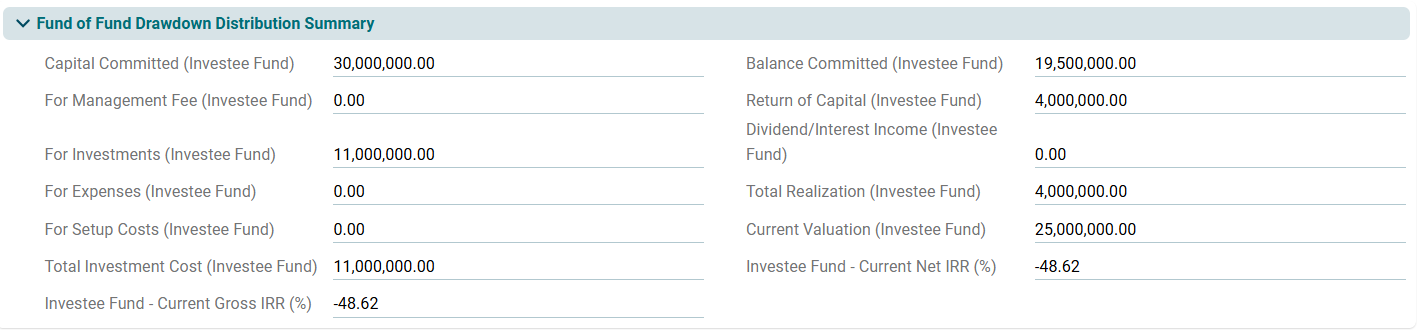 This panel allows you to view the details of total drawdown and distribution with investors. This is an auto-populated panel flowing from D/D tab.
