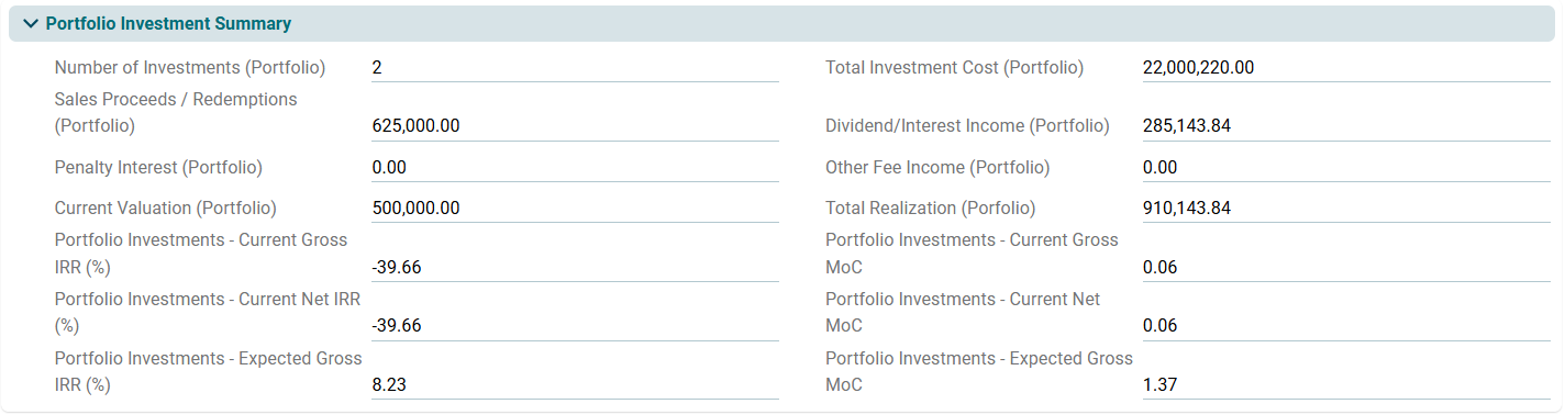 This panel allows you to view details of direct portfolio investment and return on those investments. This is an auto-populated panel flowing from Portfolio Investments tab.