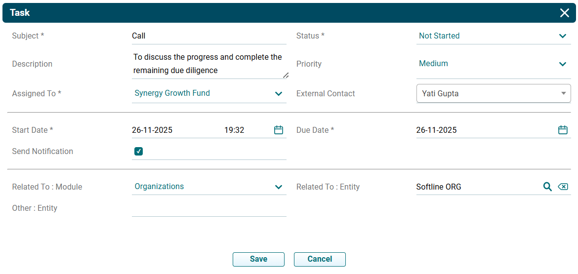 3. The Task window is displayed. You can add the details for creating the task. The details included are: