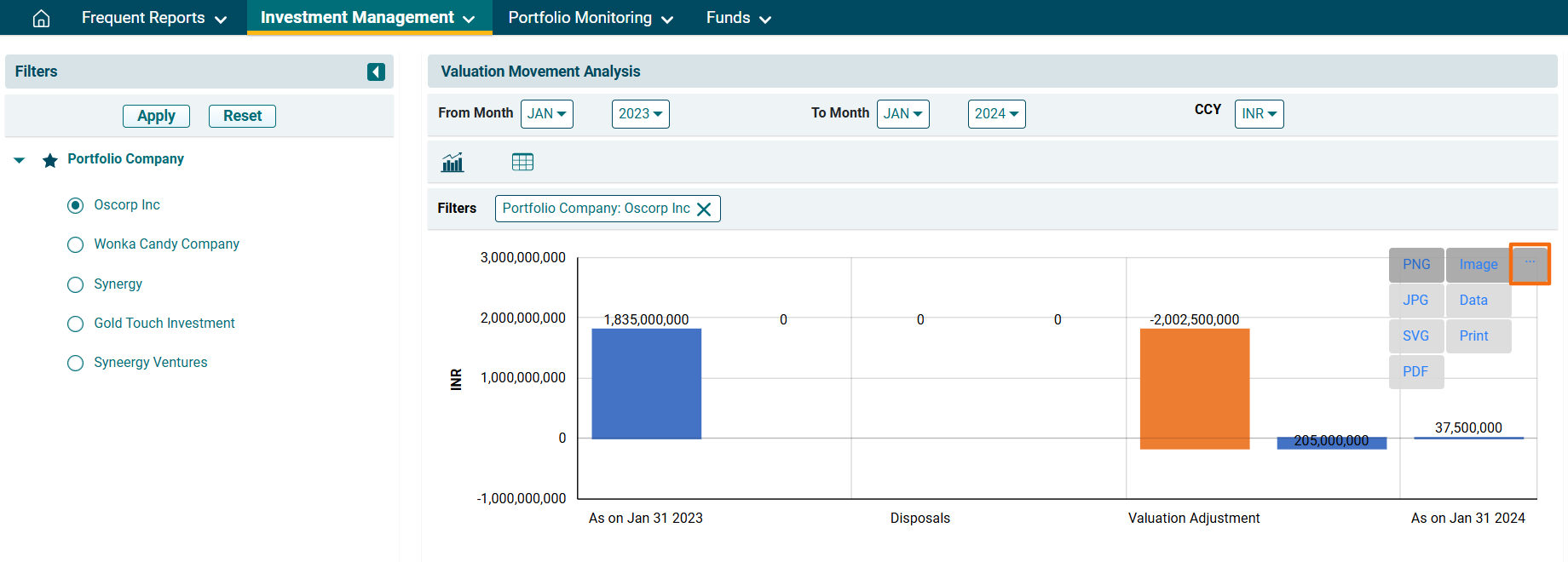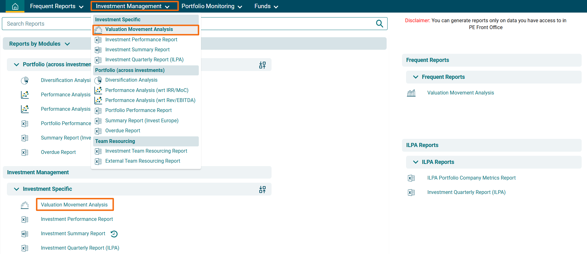 2. A new window is displayed. You can access the report from the dashboard by clicking Valuation Movement Analysis in the Investment Management panel or from the Investment Management drop-down menu in the blue vertical bar.