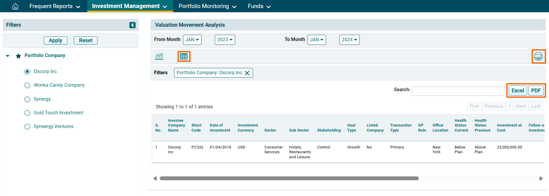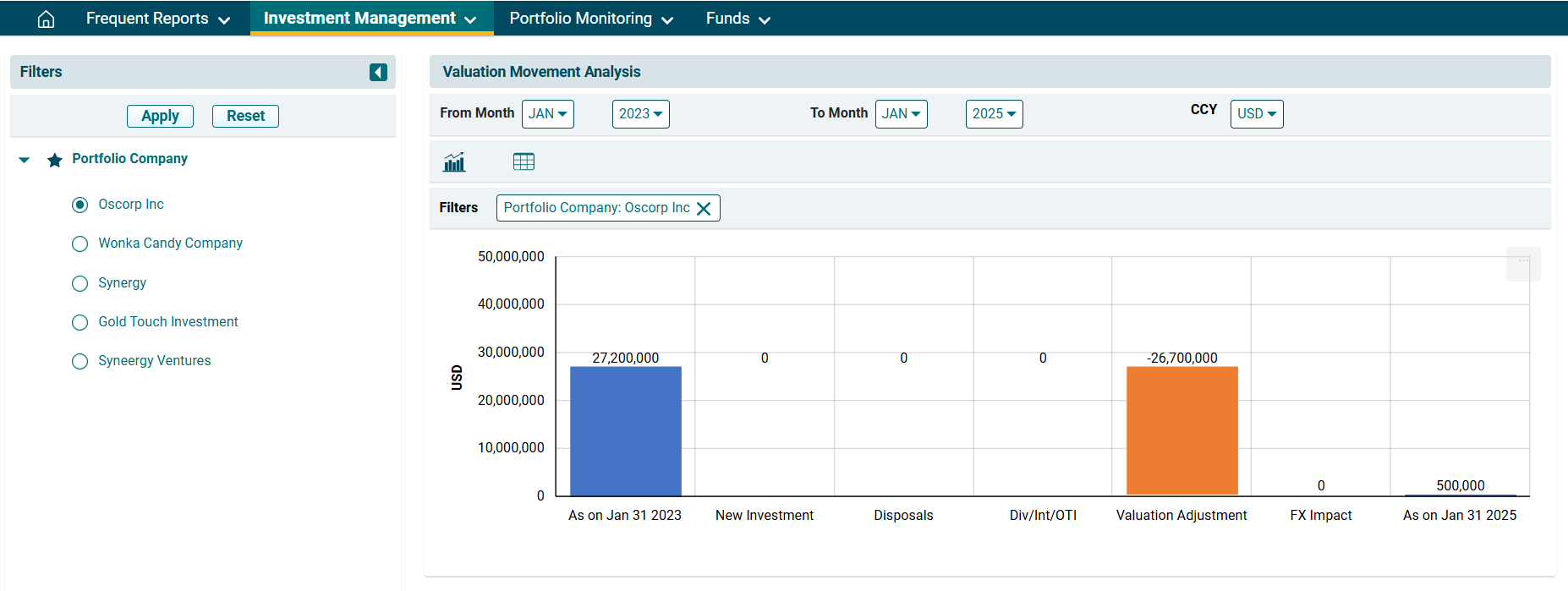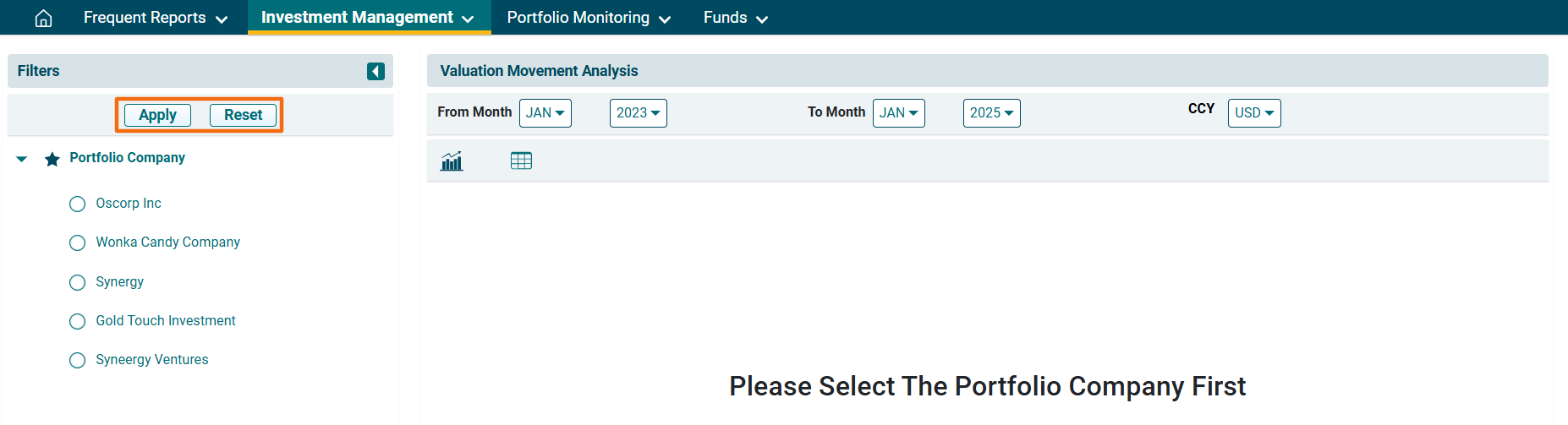 3. The Valuation Movement Analysis window is displayed. Using the filters on the left-hand side, select the Portfolio Company. Click Apply.