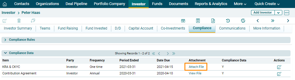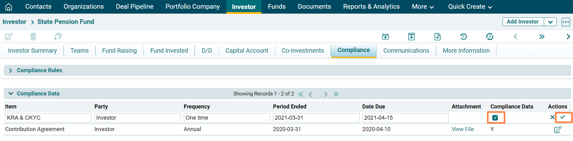 Once the rule has been defined for an item in the Compliance Rules, the Compliance Data panel allows you to capture the required documentation associated with the compliance rule.