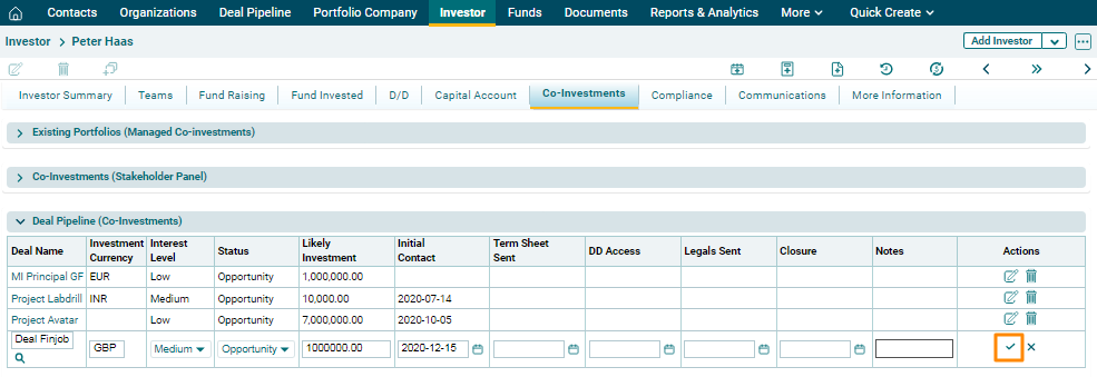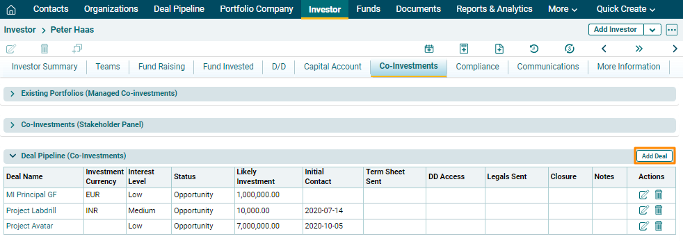 The Deal Pipeline (Co-Investments) panel allows you to capture an investor’s interest in a deal. The details included are: